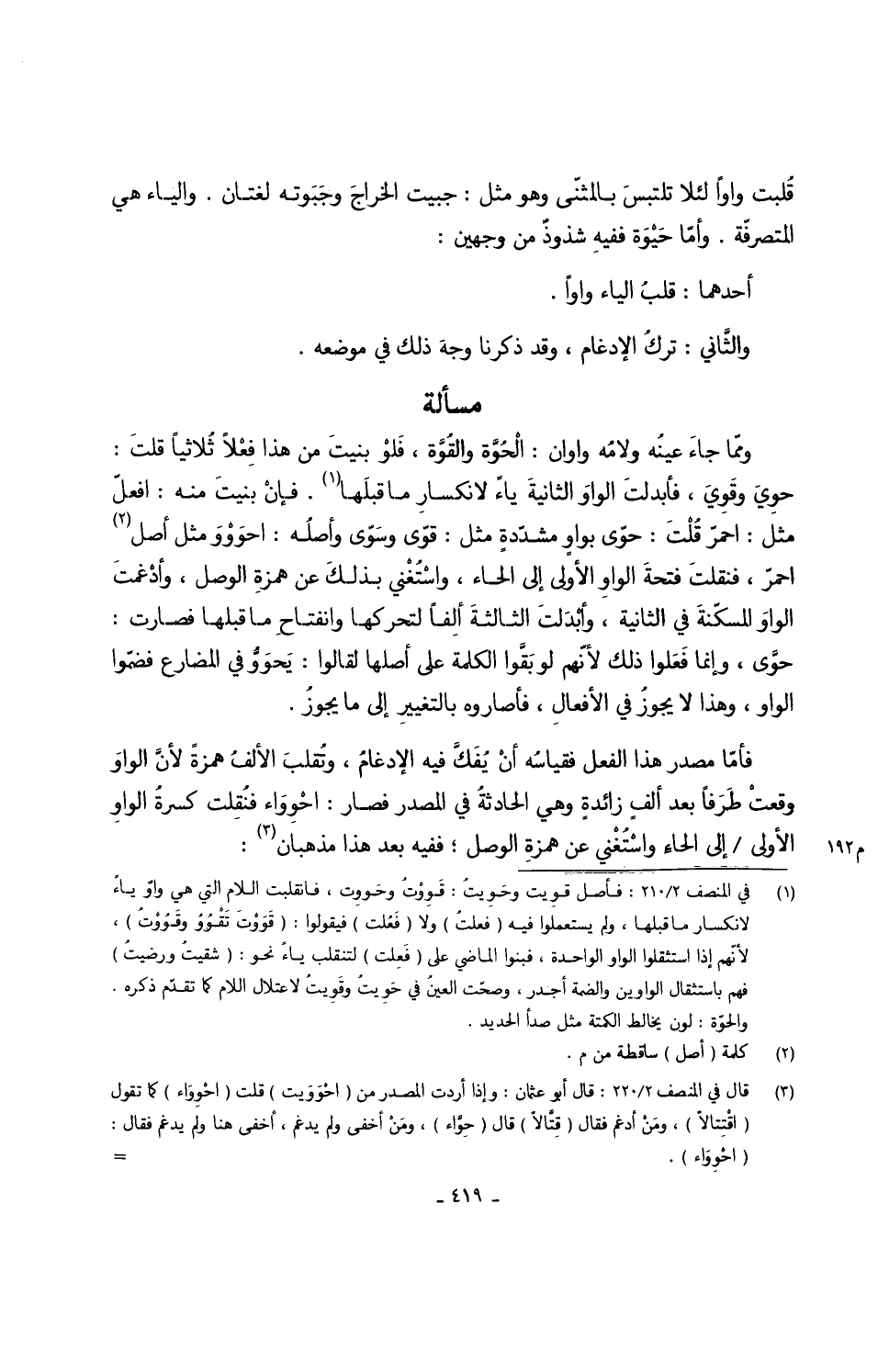 وممّا جاءَ عينُه ولامُه واوان الحُوَّة والقُوَّة فَلَوْ بنيتَ من هَذَا فِعْلاً ثُلاثياً قلتَ حوِيَ وقَوِيَ فأبدلت الواوَ الثانيةَ يَاء لانكسارِ مَا قبلَها فإنْ بنيتَ مِنْهُ افعلّ مثل احمرّ قُلْتَ حوّى بواوٍ مشدّدةٍ مثل قوّى وسوّى وأصلُه احوَوْوَ مثل أصل احمرّ فنقلتَ فتحةَ الواوِ الأولى إِلَى الْحَاء واسْتُغْني بذلك عَن همزةِ الْوَصْل وأدْغمتَ الواوَ المسكّنةَ فِي الثَّانِيَة وأبْدَلتَ الثالثةَ ألِفاً لتحركها وانفتاحِ مَا قبلهَا فَصَارَت حوَّى وَإِنَّمَا فَعَلوا ذَلِك لأنّهم لَو بَقَّوا الْكَلِمَة على أَصْلهَا لقالوا يَحوَوٌّ فِي الْمُضَارع فضمّوا الْوَاو وَهَذَا لَا يجوزُ فِي الأفعالِ فأصاروه بالتغييرِ إِلَى مَا يجوزُ