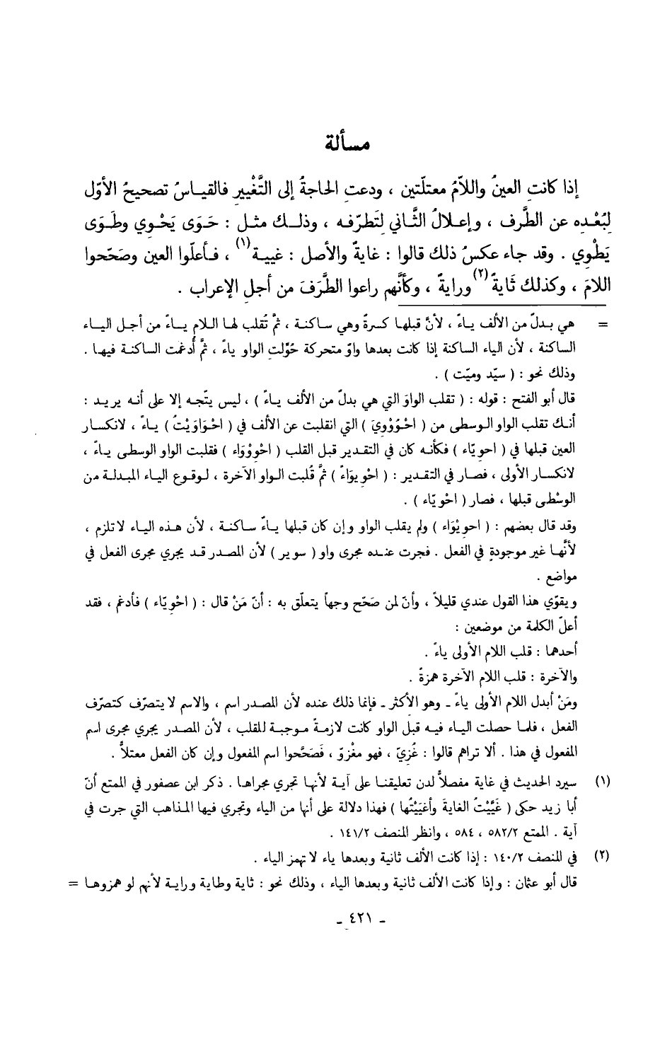إِذا كانتِ العينُ واللاّمُ معتلّتين ودعتِ الحاجةُ إِلَى التَّغْييرِ فالقياسُ تصحيحُ الأوّل لِبُعْدِه عَن الطَّرف وإعلالُ الثَّاني لِتَطرّفه وَذَلِكَ مثل حَوَى يَحْوى وطَوَى يَطْوِي وَقد جَاءَ عكسُ ذَلِك قَالُوا غايةٌ وَالْأَصْل غيبَة فأعلّوا الْعين وصَحّحوا اللامَ وكذلكَ ثَايةٌ ورايةٌ وكأنَّهم راعوا الطَّرَفَ من أجلِ الْإِعْرَاب