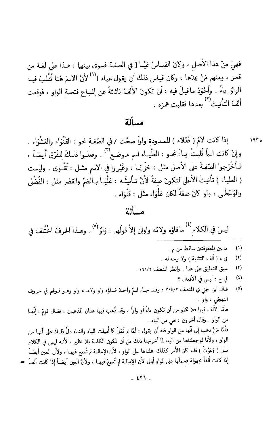 إِذا كَانَت لامُ فَعْلاء الممدودةِ واواً صحَّت فِي الصّفةِ نَحْو القَنْوَاء والعَشْوَاء وإنْ كَانَت اسْما قُلبتْ يَاء نَحْو العَلْياء اسْم مَوضِع وفعلوا ذلكَ لِلفَرْق أَيْضا فأخْرَجوا الصّفة على الأَصْل مثل خَزْيَا وغيَّروا فِي الِاسْم مثل تَقْوَى وَلَيْسَت العلياء تأنيثَ الْأَعْلَى لتكونَ صفة لأنَّ تأنيثَه عُلْيَا بالضمّ والقصْر الفُضلى والوُسْطَى وَلَو كَانَ صفة لَكَانَ عَلْوَاء مثل قَنْوَاء