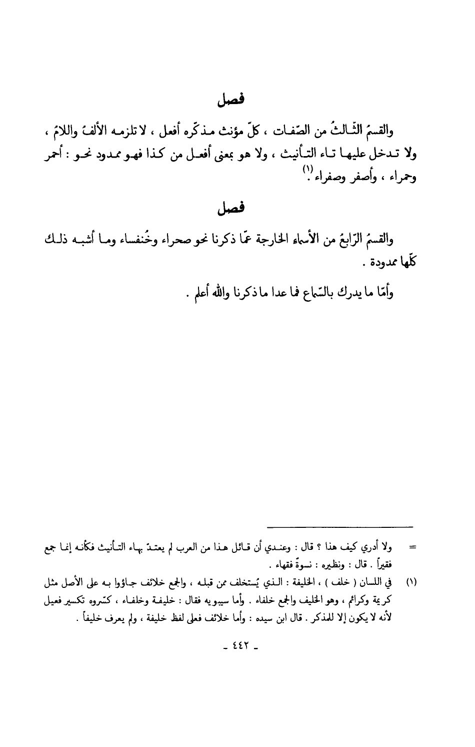 والقسمُ الثّالثُ من الصّفات كلّ مؤنث مذكّره أفعل لَا تلْزمهُ الألفُ واللامُ وَلَا تدخل عَلَيْهَا تَاء التَّأْنِيث وَلَا هُوَ بِمَعْنى أفعل من كَذَا فَهُوَ مَمْدُود نَحْو أَحْمَر وحمراء وأصفر وصفراء