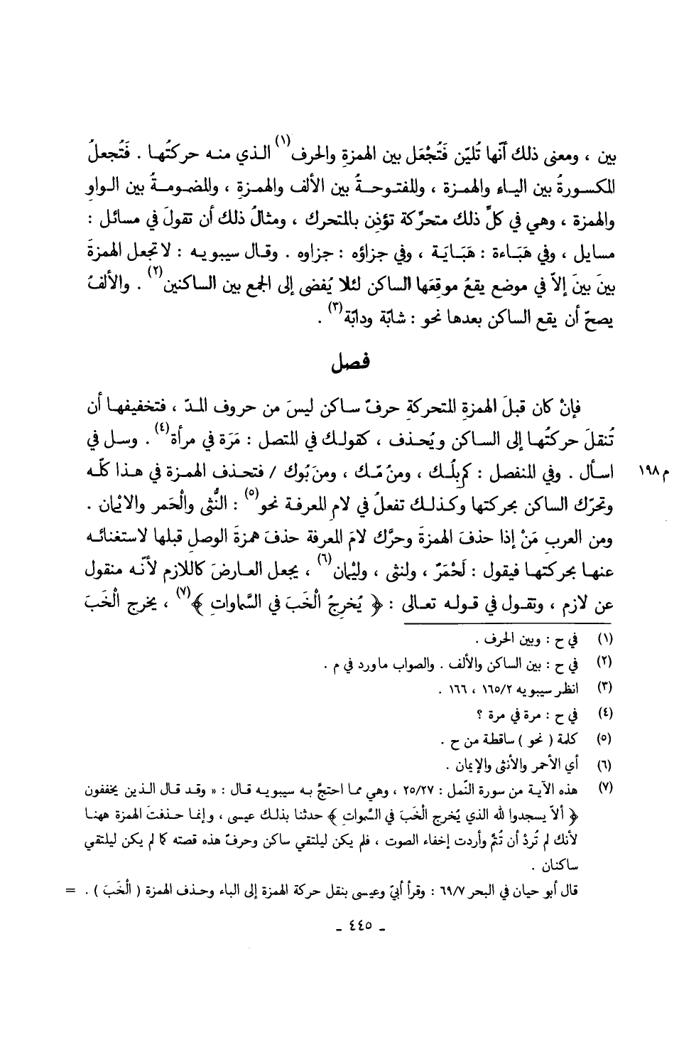 بَين وَمعنى ذَلِك أنَّها تُليّن فَتُجْعَل بَين الهمزةِ والحرف الَّذِي مِنْهُ حركتُها فتُجعلُ المكسورةُ بَين الْيَاء والهمزة والمفتوحةُ بَين الْألف والهمزةِ والمضمومةِ بَين الواوِ والهمزة وَهِي فِي كلِّ ذَلِك متحرِّكة تؤذنِ بالمتحرك ومثالُ أَن تقولَ فِي مسَائِل مسايل وَفِي هَبَاءة هَبَايَة وَفِي جَزَاؤُهُ جزاوه وَقَالَ سِيبَوَيْهٍ لَا تجْعَل الهمزةَ بينَ بينَ إِلَّا فِي مَوضِع يقعُ موقِعَها السَّاكِن لِئَلَّا يُفضى إِلَى الْجمع بَين الساكنين والألفُ يصحّ أَن يَقع السَّاكِن بعْدهَا نَحْو شابّة ودابّة