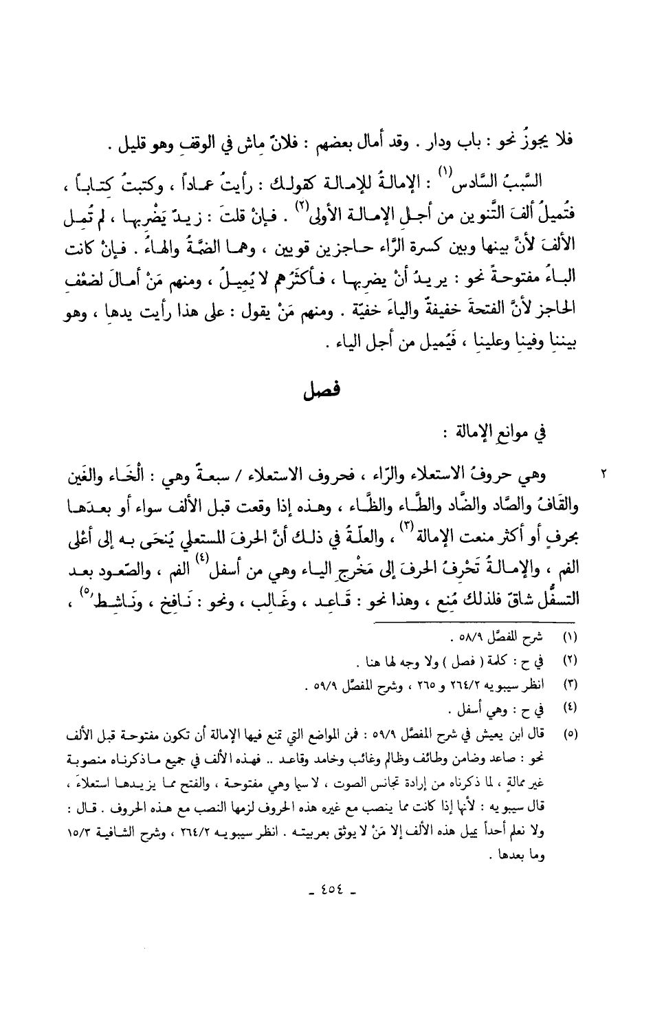 السَّببُ السَّادس الإِمالةُ كَقَوْلِك رأيتُ عماداً وكتبتُ كِتاباً فتُميلُ ألفَ التَّنوين من أجلِ الإمالة الأولى فإنْ قلتَ زيدٌ يَضْرِبها لم تُمِل الألفَ لأنَّ بَينهَا وَبَين كسرة الرَّاء حاجزين قويين وهما الضمَّةُ والهاءُ فإنْ كَانَت الباءُ مَفْتُوحَة نَحْو يريدُ أنْ يضرِبها فأكثَرُهم لَا يُميلُ وَمِنْهُم مَنْ أمالَ لضعْفِ الحاجز لأنَّ الفتحةَ خفيفةٌ والياءَ خفيّة وَمِنْهُم مَنْ يَقُول على هَذَا رَأَيْت يدِها وَهُوَ بَيْننَا وَفينَا وعلينِا فيُميل من أجل الْيَاء
