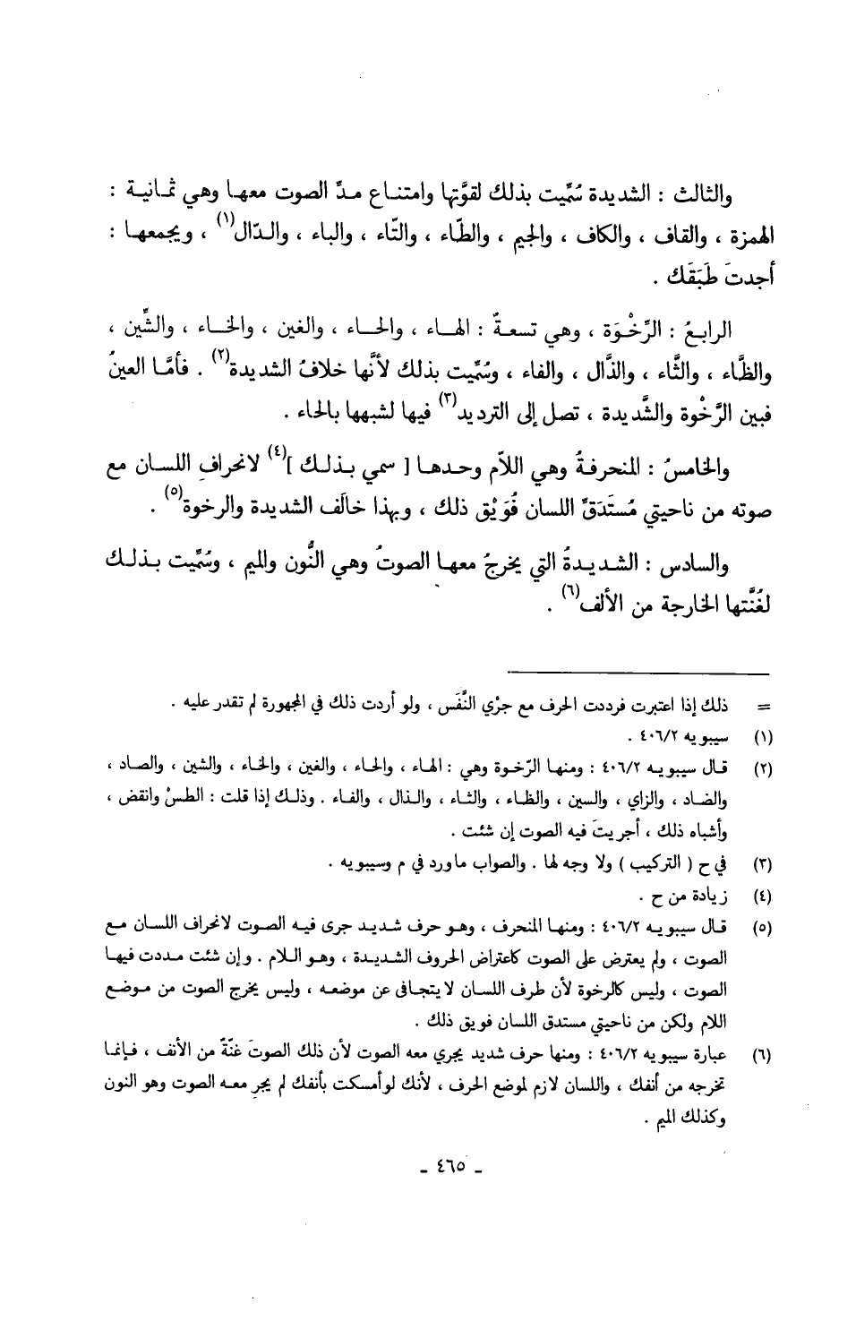 وَالثَّالِث الشَّدِيدَة سُمِّيت بذلك لقوَّتها وَامْتِنَاع مدِّ الصَّوْت مَعهَا وَهِي ثَمَانِيَة الْهمزَة وَالْقَاف وَالْكَاف وَالْجِيم والطّاء والتّاء وَالْبَاء والدّال ويجمعها أَجدت طَبَقَك الرابعُ الرَّخْوَة وَهِي تسعةٌ الْهَاء والحاء والغين وَالْخَاء والشِّين والظَّاء والثَّاء والذَّال وَالْفَاء وسُمِّيت بذلك لأنَّها خلافُ الشَّدِيدَة فأمَّا العينُ فَبين الرَّخوة والشديدة تصل إِلَى الترديد فِيهَا لشبهها بِالْحَاء