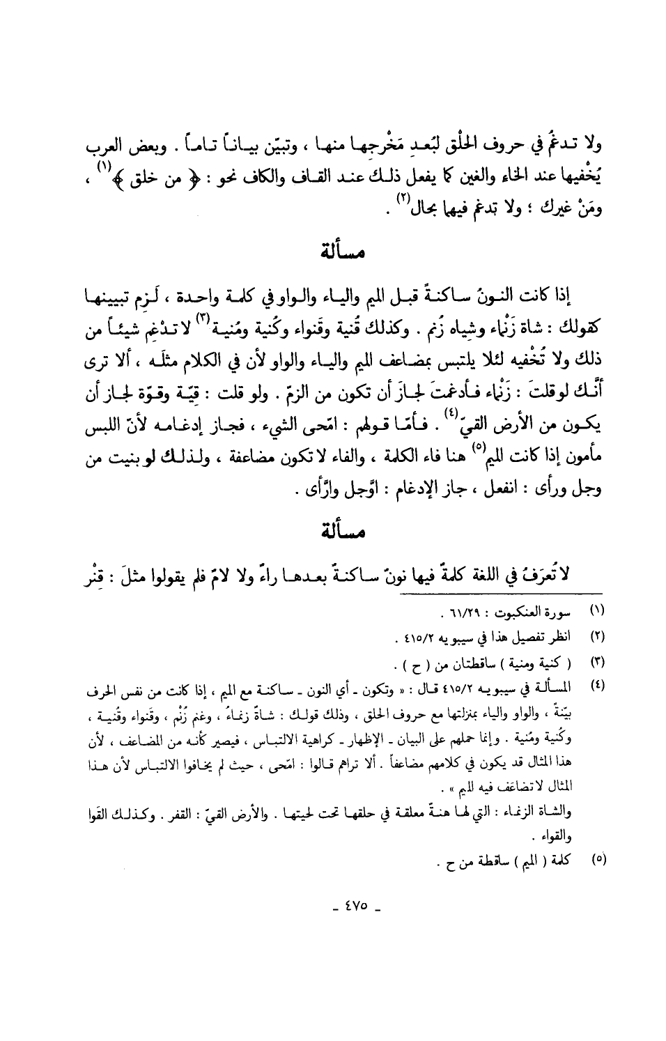 إِذا كَانَت النونُ سَاكِنة قبل الْمِيم وَالْيَاء وَالْوَاو فِي كلمة وَاحِدَة لَزِم تبيينها كَقَوْلِك شَاة زَنْماء وشِياه زُنم وَكَذَلِكَ قُنية وقَنواء وكُنية ومُنية لَا تدْغِم شَيْئا من ذَلِك وَلَا تُخفيه لِئَلَّا يلتبس بمضاعف الْمِيم وَالْيَاء وَالْوَاو لِأَن فِي الْكَلَام مثلَه أَلا ترى أنَّك لَو قلت زَنْماء فأدغمت لجازَ أَن تكون من الزمّ وَلَو قلت قِيّة وقوّة لجَاز أَن يكون من الأَرْض القيّ فأمّا قَوْلهم امْحى الشَّيْء فَجَاز إدغامه لأنّ اللّبْس مَأْمُون إِذا كَانَت الْمِيم هُنَا فَاء الْكَلِمَة وَالْفَاء لَا تكون مضاعفة وَلذَلِك لَو بنيت من وَجل وَرَأى انفعل جَازَ الْإِدْغَام اوَّجل وارَّأى
