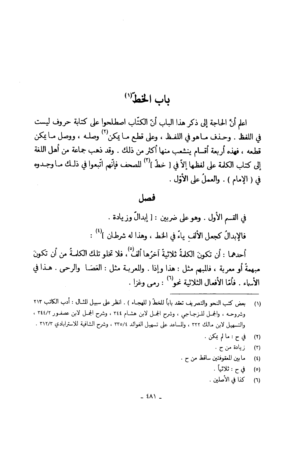 اعْلَم أنَّ الْحَاجة الى ذكر هَذَا الْبَاب أنّ الكتّاب اصْطَلحُوا على كِتَابَة حُرُوف لَيست فِي اللَّفْظ وَحذف مَا هُوَ فِي اللَّفْظ وعَلى قطع مَا يُمكن وَصله وَوصل مَا يُمكن قطعه فَهَذِهِ أَرْبَعَة أَقسَام ينشعب مِنْهَا أَكثر من ذَلِك وَقد ذهب جمَاعَة من أهل اللُّغَة الى كتاب الْكَلِمَة على لَفظهَا إلاّ فِي خطّ الْمُصحف فإنّهم اتّبعوا فِي ذَلِك مَا وجدوه فِي الإِمَام والعملُ على الأوّل
