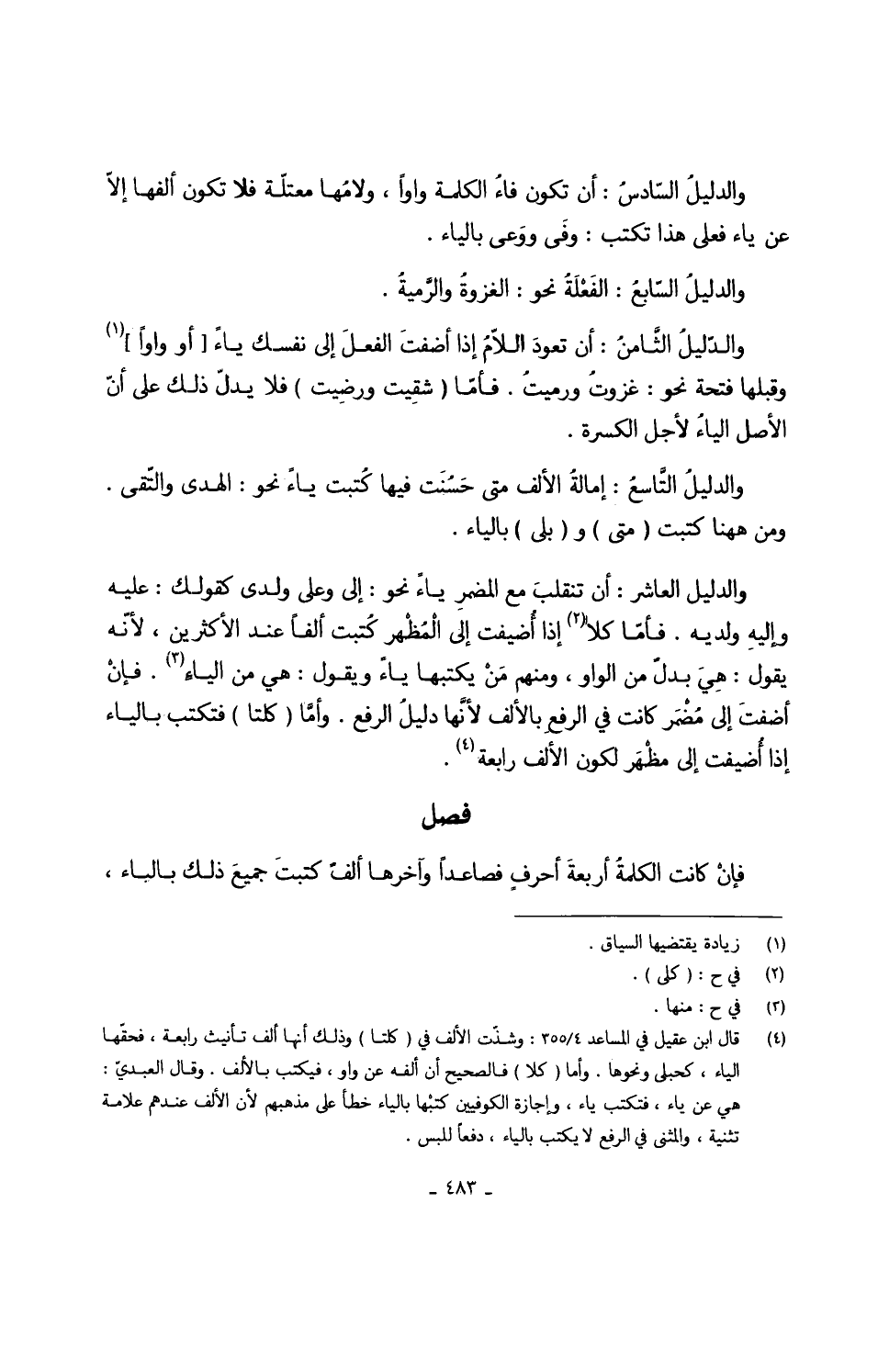 وَالدَّلِيل الْعَاشِر أَن تنقلبَ مَعَ المضمرِ يَاء نَحْو إِلَى وعَلى وَلَدي كَقَوْلِك عَلَيْهِ وَإِلَيْهِ ولديه فأمّا كلا إِذا أُضيفت إِلَى المُظْهَرِ كُتبت ألفا عِنْد الْأَكْثَرين لأنّه يَقُول هِيَ بدلٌ من الْوَاو وَمِنْهُم مَنْ يَكْتُبهَا يَاء وَيَقُول هِيَ من الياءِ فإنْ أضفتَ إِلَى مُضْمَر كَانَت فِي الرفعِ بِالْألف لأنَّها دليلُ الرّفْع وأمَّا كلتا فتكتب بِالْيَاءِ إِذا أضيفت إِلَى مظْهَر لكَون الْألف رَابِعَة