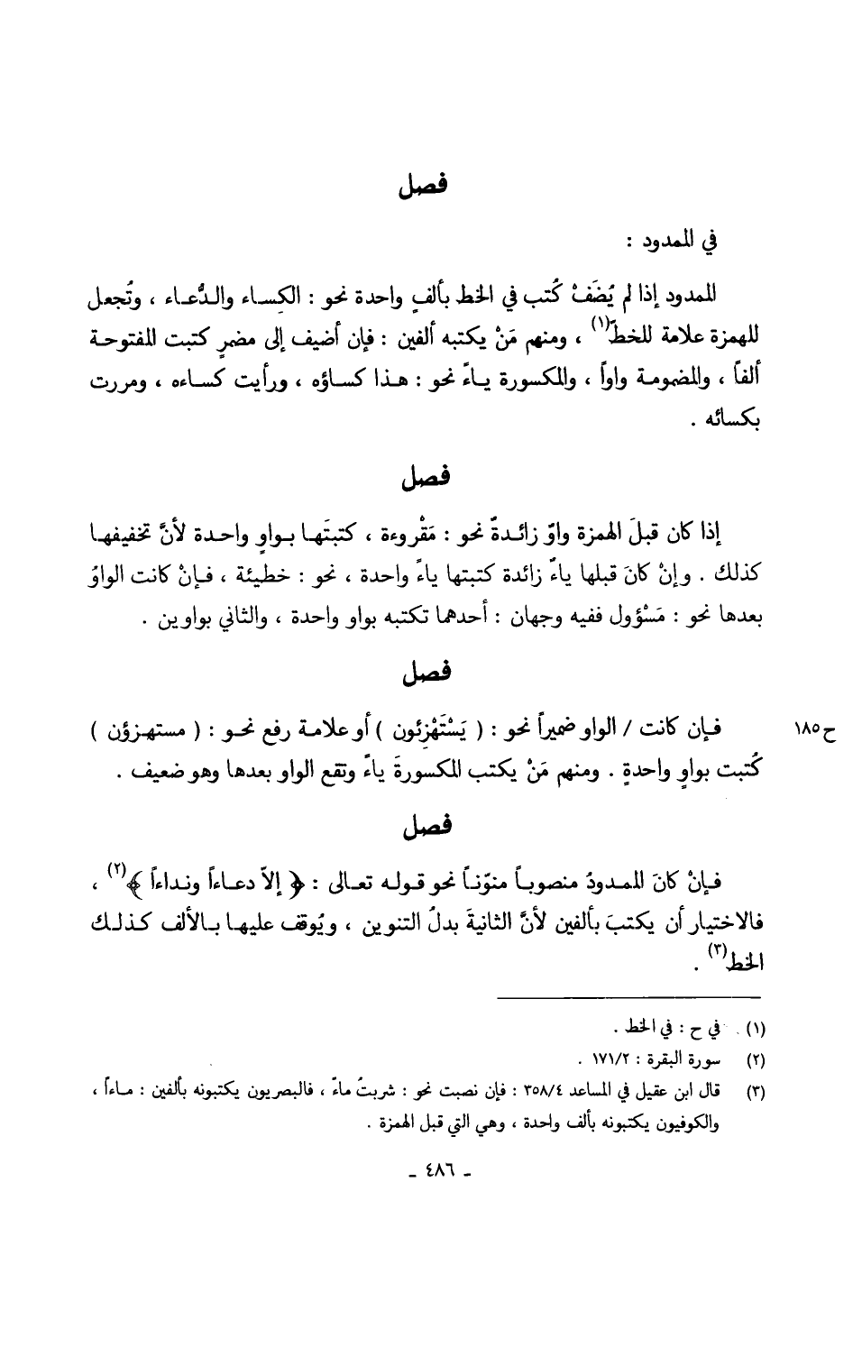 الْمَمْدُود إِذا لم يُضَفْ كُتب فِي الْخط بألفٍ وَاحِدَة نَحْو الكساء والدُّعاء وتُجعل للهمزة عَلامَة للخطّ وَمِنْهُم مَنْ يَكْتُبهُ أَلفَيْنِ فَإِن أضيف إِلَى مضمرٍ كتبت الْمَفْتُوحَة ألفا والمضمومة واواً والمكسورة يَاء نَحْو هَذَا كساؤه وَرَأَيْت كساءه ومررت بكسائه