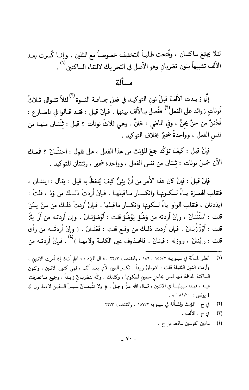 إنَّما زيدت الألفُ قبلَ نونِ التوكيد فِي فعلِ جمَاعَة النسْوَة لئلاّ تتوالى ثلاثُ نُوناتٍ زَوَائِد على الْفِعْل ففُصل بِالْألف بَينهمَا فإنْ قيل فقد قَالُوا فِي الْمُضَارع تَحْنِنَّ من حنَّ يحِنُّ وَفِي الْمَاضِي حَنّنَّ وَهِي ثلاثُ نونات قيل ثِنْتان مِنْهَا من نفسِ الْفِعْل وواحدةٌ ضميرٌ بِخِلَاف التوكيد