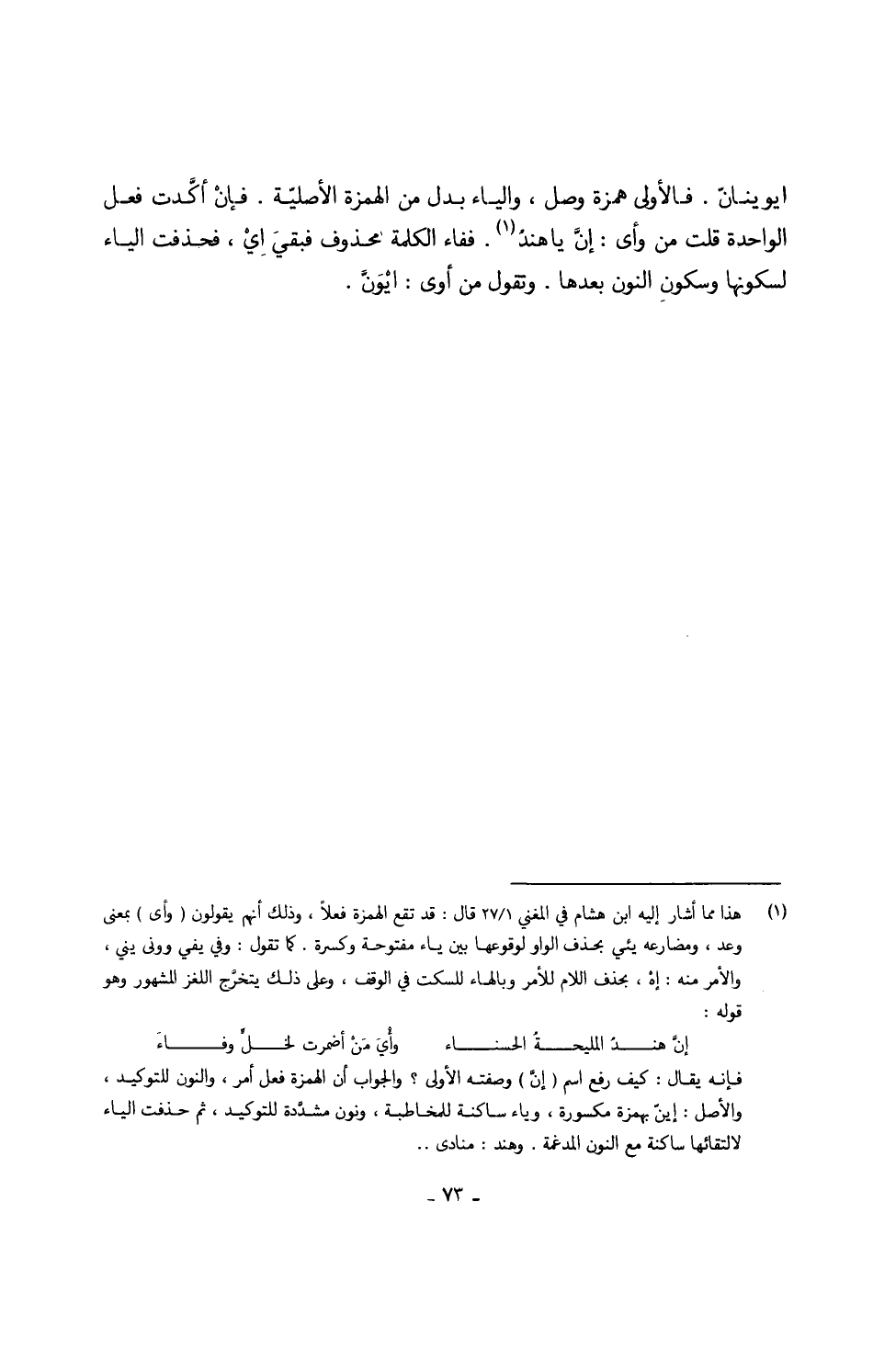 ايتونيانّ فَالْأولى همزَة وصل وَالْيَاء بدل من الْهمزَة الأصليّة فإنْ أكَّدت فعل الْوَاحِدَة قلت من وأى إنَّ يَا هندُ ففاء الْكَلِمَة مَحْذُوف فبقيَ اِيْ فحذفت الْيَاء لسكونها وسكونِ النُّون بعْدهَا وَتقول من أَوَى ايْوَنَّ