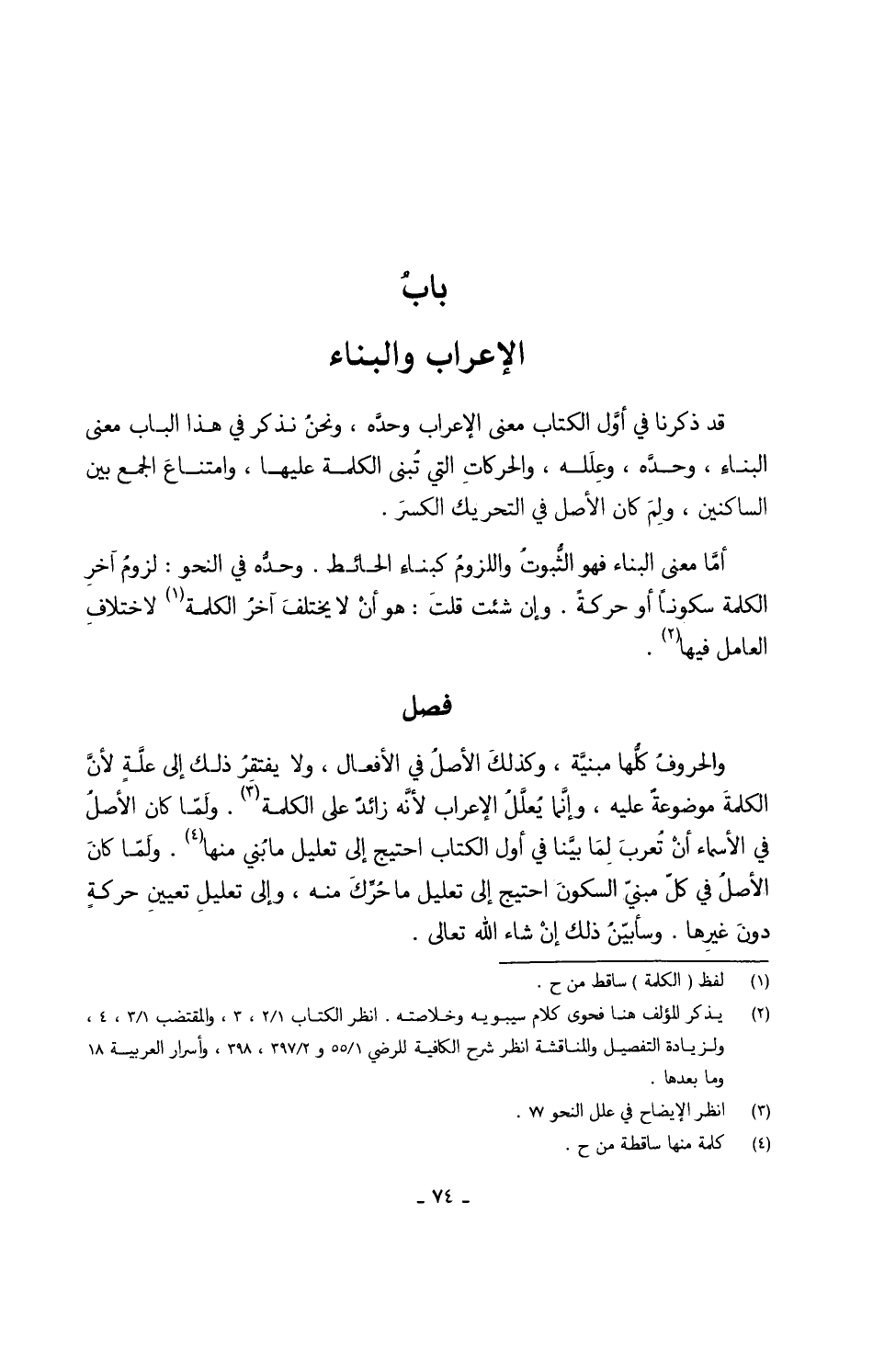 والحروفُ كلُّها مبنيَّة وكذلكَ الأصلُ فِي الْأَفْعَال وَلَا يفتقِرُ ذَلِك إِلَى علَّةٍ لأنَّ الكلمةَ موضوعةٌ عَلَيْهِ وإنَّما يُعلَّلُ الْإِعْرَاب لأنَّه زائدٌ على الْكَلِمَة ولَمَّا كَانَ الأصلُ فِي الْأَسْمَاء أنْ تُعربِ لِمَا بيَّنا فِي أول الْكتاب احْتِيجَ إِلَى تَعْلِيل مَا بُني مِنْهَا ولَمّا كانَ الأصلُ فِي كلّ مبنيّ السكونَ احْتِيجَ إِلَى تَعْلِيل مَا حُرِّكَ مِنْهُ وَإِلَى تعليلِ تعيينِ حركةٍ دونَ غيرِها وسأبيّنُ ذَلِك إنْ شَاءَ الله تَعَالَى