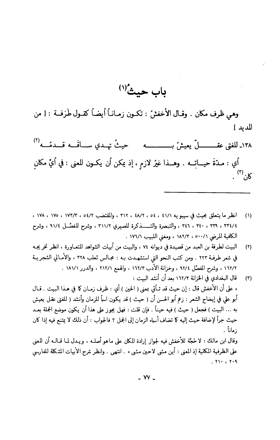 وَهِي ظرف مَكَان وَقَالَ الأخفشُ تكون زَمَانا أَيْضا كَقَوْل طَرَفة من // المديد // (للفتى عقلٌ يعيشُ بِهِ ... حيثُ تهدي ساقَه قدمُه)