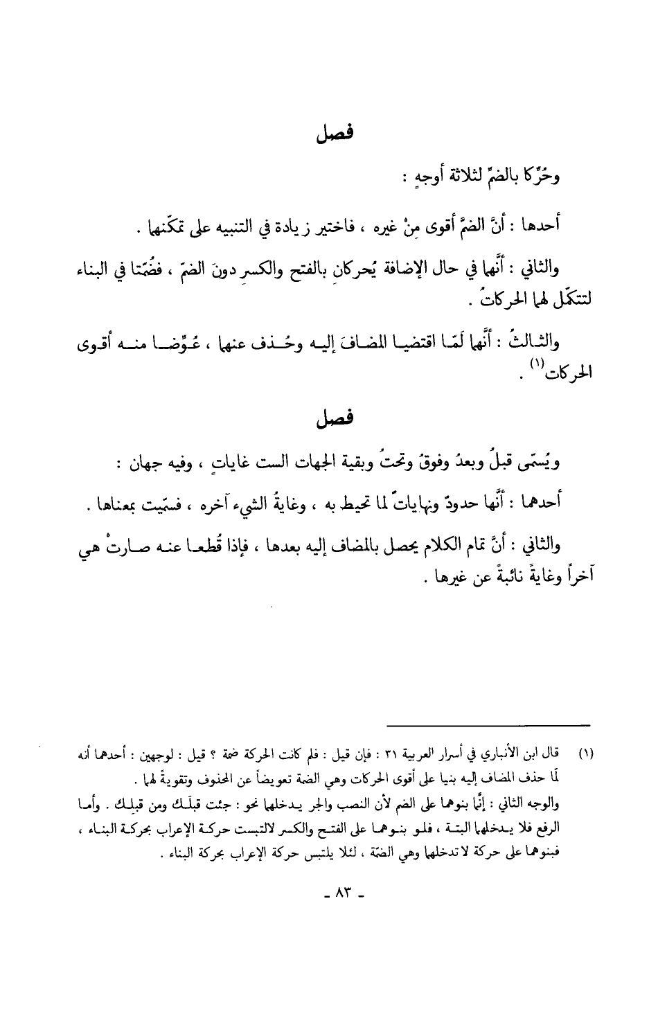 وَالثَّانِي أنَّهما فِي حَال الْإِضَافَة يُحركانِ بِالْفَتْح والكسرِ دون الضمّ فضُمَّتا فِي الْبناء لتتكمّل لَهما الحركاتُ