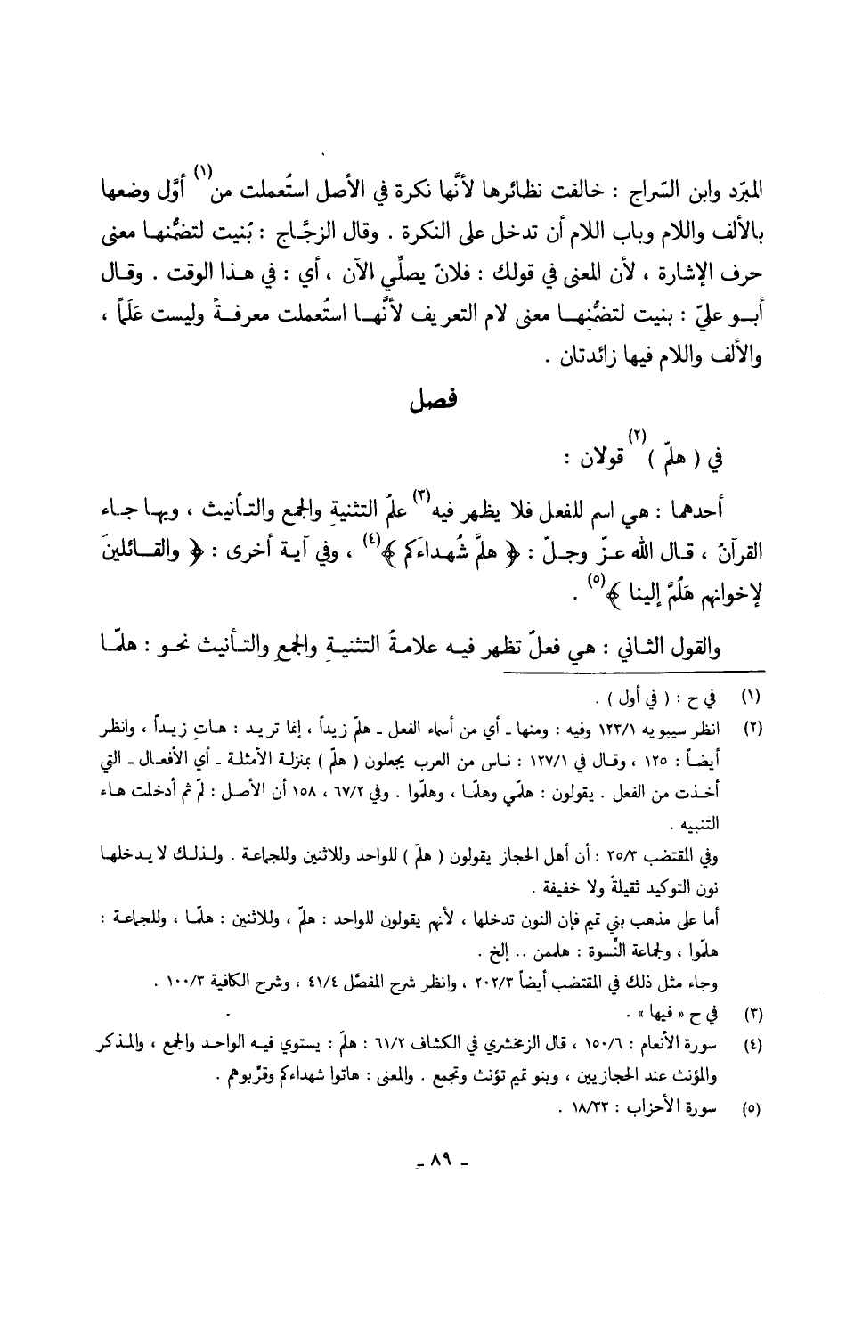 أَحدهمَا هِيَ اسْم للفعلِ فَلَا يظْهر فِيهِ علمُ التثنيةِ وَالْجمع والتأنيث وَبهَا جَاءَ القرآنُ قَالَ الله عزّ وجلّ {هلمَّ شُهداءَكم} وَفِي آيَة أُخْرَى (والقائلينَ لإخوانهم هَلُمَّ إِلَيْنَا)