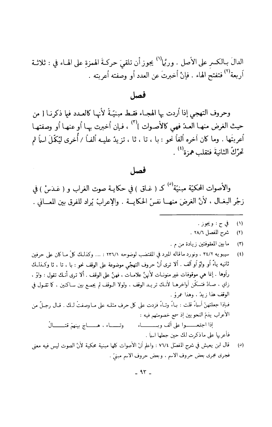 وحروف التهجي إِذا أردْت بهَا الهجاء فَقَط مبنيَّةً لِأَنَّهَا كالعدد فِيمَا ذكرنَا من حَيْثُ الْغَرَض مِنْهَا العدّ فَهِيَ كالأصوات فَإِن أخْبرت بهَا أَو عَنْهَا أَو وصفتها أعربتَها وَمَا كَانَ آخِره ألفا نَحْو با تا ثا تزيدُ عَلَيْهِ ألفا أُخرى ليُكمّلَ اسْما ثمَّ تحرِّكُ الثَّانِيَة فتقلب همزَة