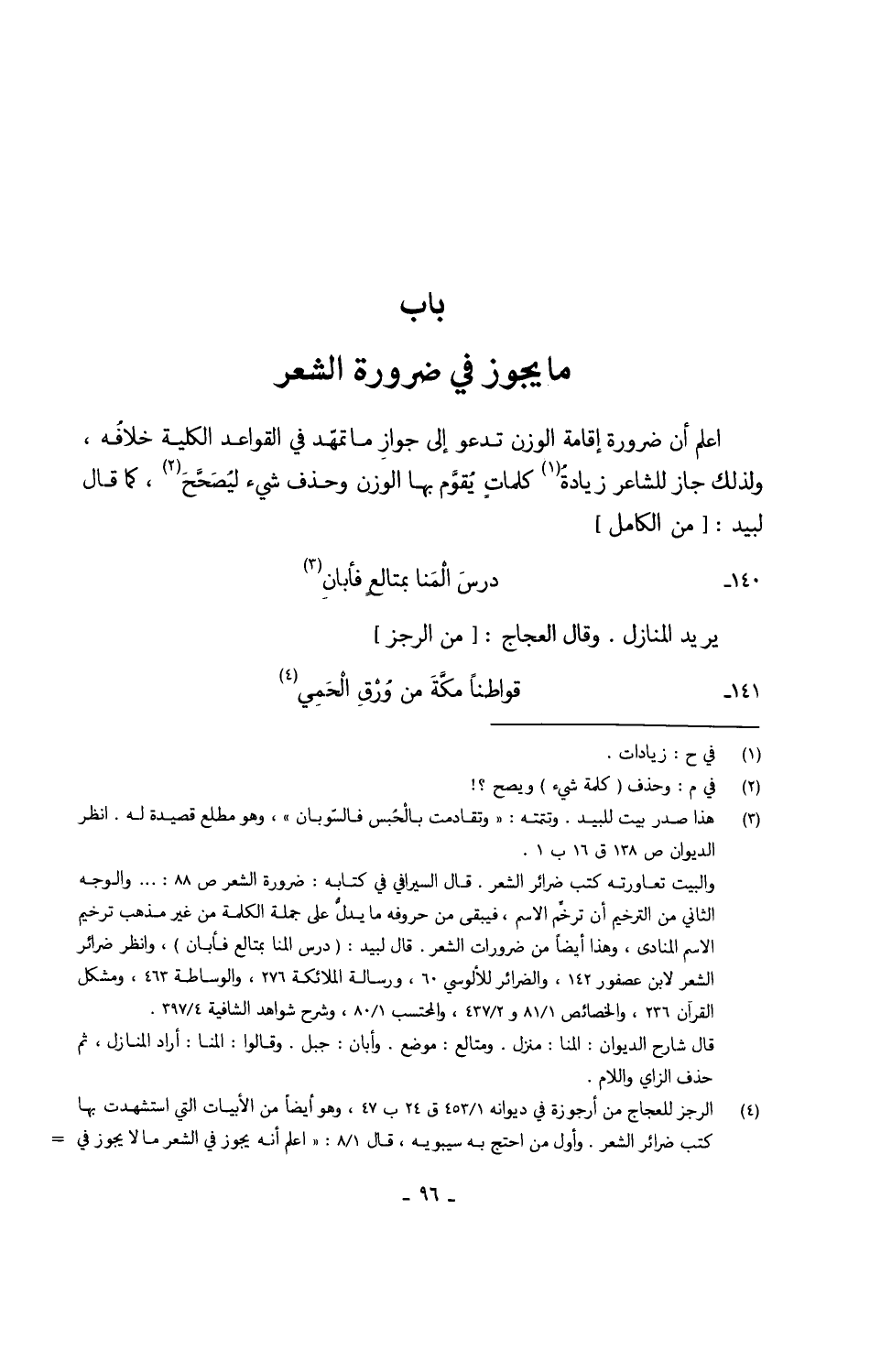 اعْلَم أَن ضَرُورَة إِقَامَة الْوَزْن تَدْعُو إِلَى جوازِ مَا تمهّد فِي الْقَوَاعِد الْكُلية خلافُه وَلذَلِك جَازَ للشاعر زيادةُ كلماتٍ يُقوِّم بهَا الْوَزْن وَحذف شَيْء ليُصَحَّحَ كَمَا قَالَ لبيد من // الْكَامِل // ( ... درسَ الْمَنا بمتالعٍ فأبانِ)