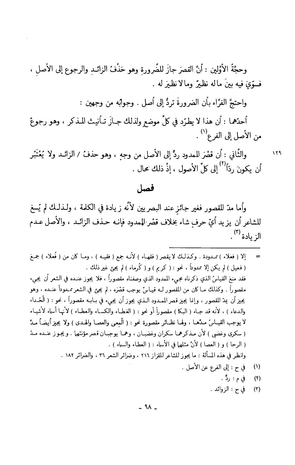 والثَّاني أَن قَصْرَ الْمَمْدُود ردٌّ إِلَى الأَصْل من وجهٍ وَهُوَ حذفُ الزَّائِد وَلَا يُعْتَبرُ أَن يكون ردّاً إِلَى كلّ الْأُصُول إذْ ذَلِك محَال