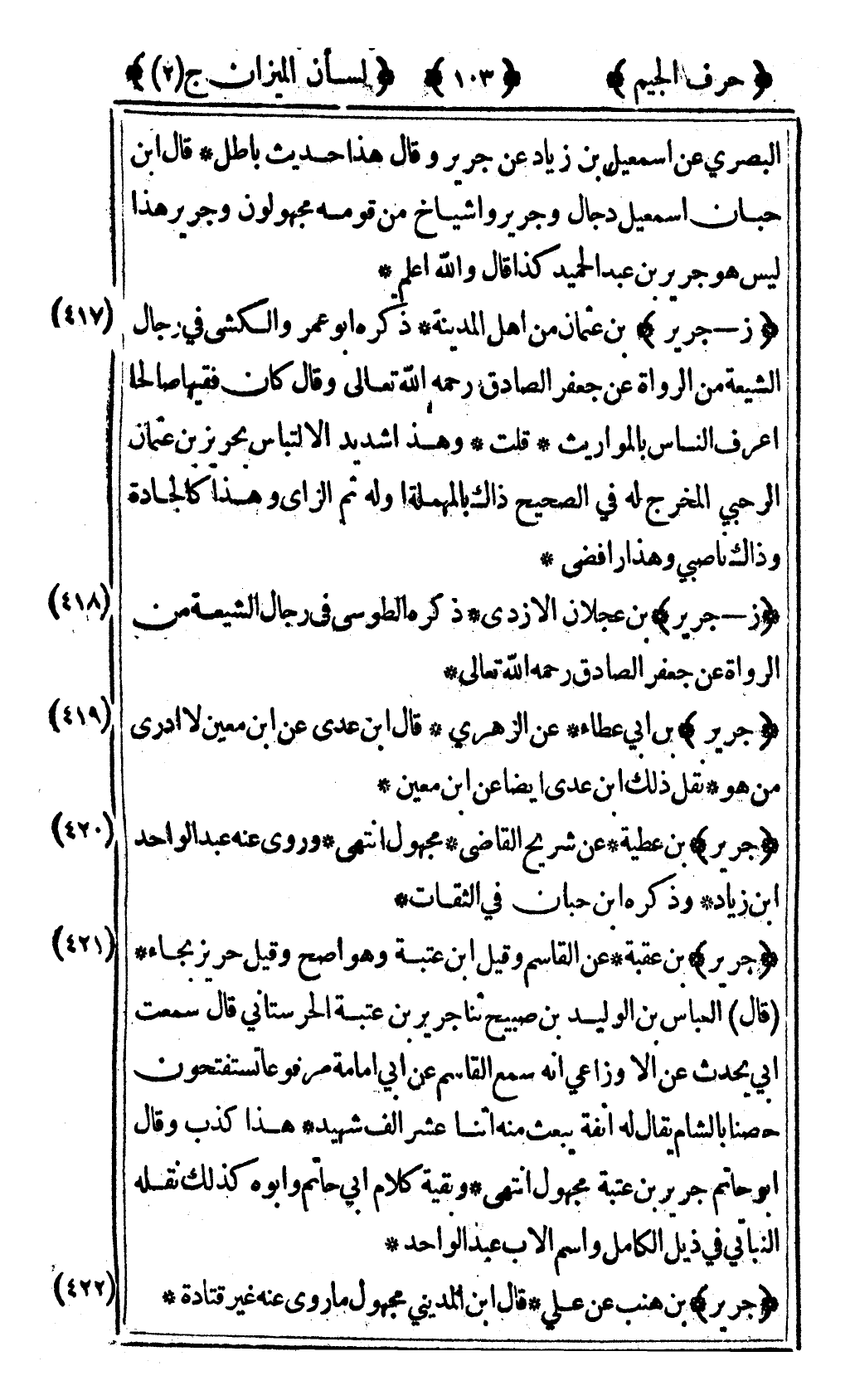 [422] "جرير" بن هنب عن علي قال ابن المديني مجهول ما روى عنه غير قتادة.