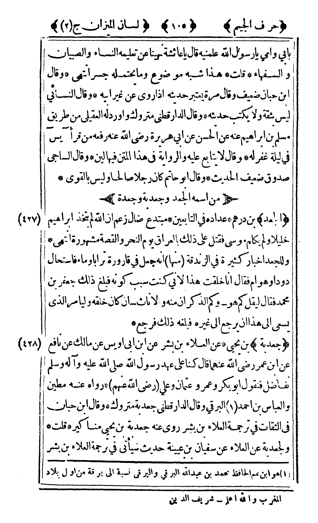 [428] "جعدبة" بن يحيى عن العلاء بن بشر عن ابن أبي أويس عن مالك عن نافع عن ابن عمر رضى الله عنهما قال كنا على عهد رسول الله صلى الله عليه وآله وسلم نفاضل فنقول أبو بكر وعمر وعثمان وعلي رضى الله عنهم رواه عنه مطين والعباس بن أحمد1 البرقي وقال الدارقطني جعدبة متروك وقال ابن حبان في الثقات في ترجمة العلاء بن بشر روى عنه جعدبة بن يحيى مناكير قلت ولجعدبة عن العلاء عن سفيان بن عيينة حديث سيأتي في ترجمة العلاء بن بشر