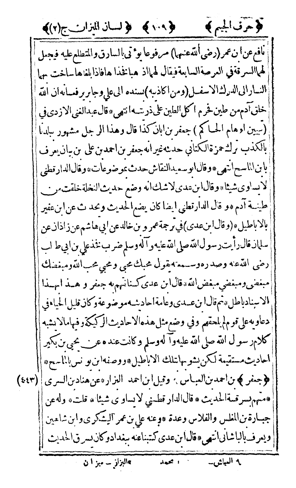[443] "جعفر" بن أحمد بن العباس1 وقيل بن أحمد البزار2 عن هناد بن السري متهم بسرقة الحديث قال الدارقطني لا يساوي شيئا قلت وله عن جبارة بن المغلس والفلاس وعدة وعنه علي بن عمر اليشكري وابن شاهين ويعرف بالباشاني انتهى قال ابن عدي كتبنا عنه ببغداد وكان يسرق الحديث