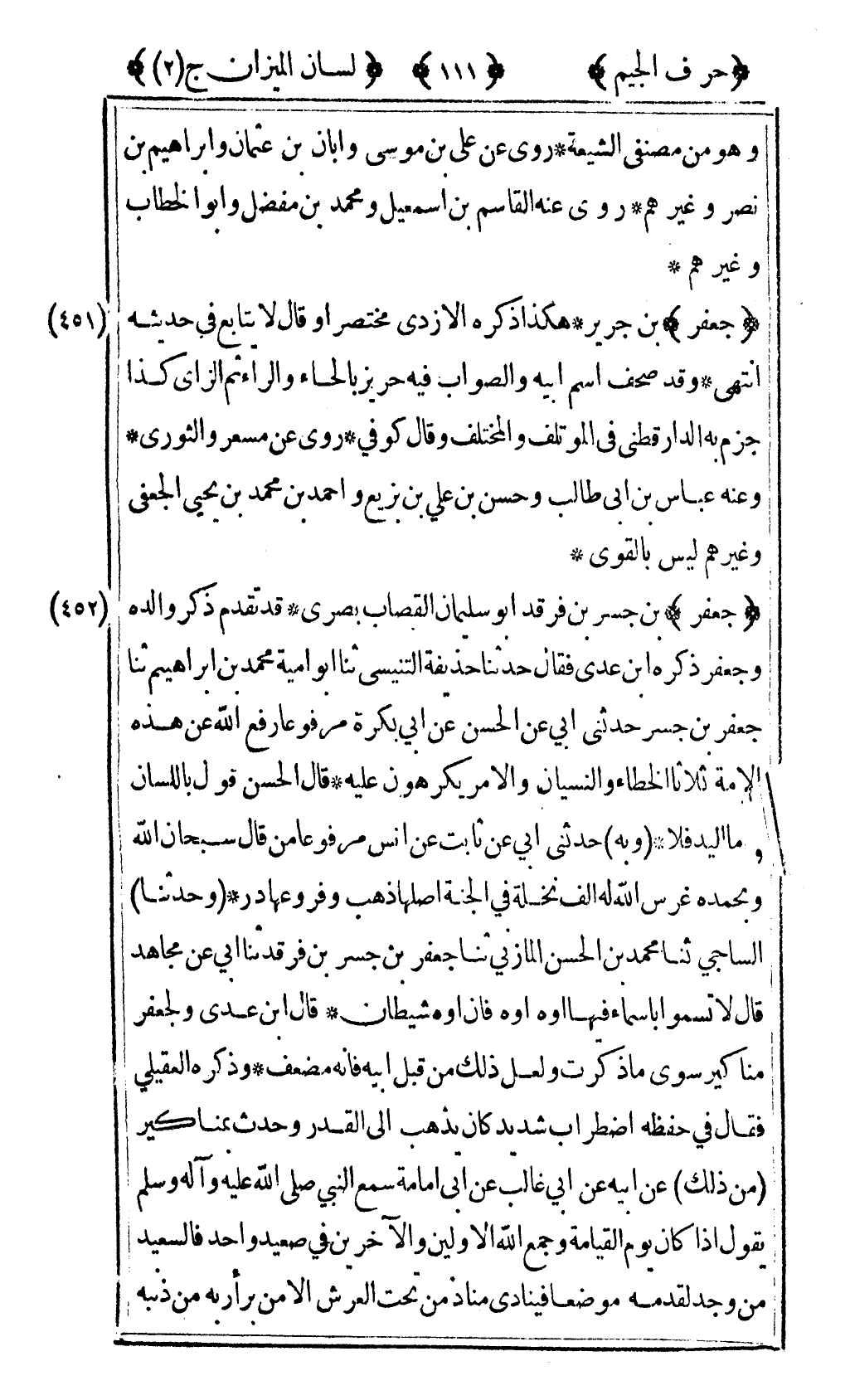 [452] "جعفر" بن جسر بن فرقد أبو سليمان القصاب بصري قد تقدم ذكر والده وجعفر ذكره ابن عدي فقال حدثنا حذيفة التنيسي ثنا أبو أمية محمد بن إبراهيم ثنا جعفر بن جسر حدثني أبي عن الحسن عن أبي بكرة مرفوعا رفع الله عن هذه الأمة ثلاثا الخطأ والنسيان والأمر يكرهون عليه قال الحسن قول باللسان وأما اليد فلا وبه حدثني أبي عن ثابت عن أنس مرفوعا "من قال سبحان الله وبحمده غرس الله له ألف نخلة في الجنة أصلها ذهب وفروعها در" وحدثنا الساجي ثنا محمد بن الحسن المازني ثنا جعفر بن جسر بن فرقد ثنا أبي عن مجاهد قال لا تسموا بأسماء فيها أوه أوه فإن أوه شيطان قال ابن عدي ولجعفر مناكير سوى ما ذكرت ولعل ذلك من قبل أبيه فإنه مضعف وذكره العقيلي فقال في حفظه اضطراب شديد كان يذهب إلى القدر وحدث بمناكير من ذلك عن أبيه عن أبي غالب عن أبي أمامة سمع النبي صلى الله عليه وآله وسلم يقول "إذا كان يوم القيامة وجمع الله الأولين والآخرين في صعيد واحد فالسعيد من وجد لقدمه موضعا فينادي مناد من تحت العرش الا من برأ ربه من ذنبه