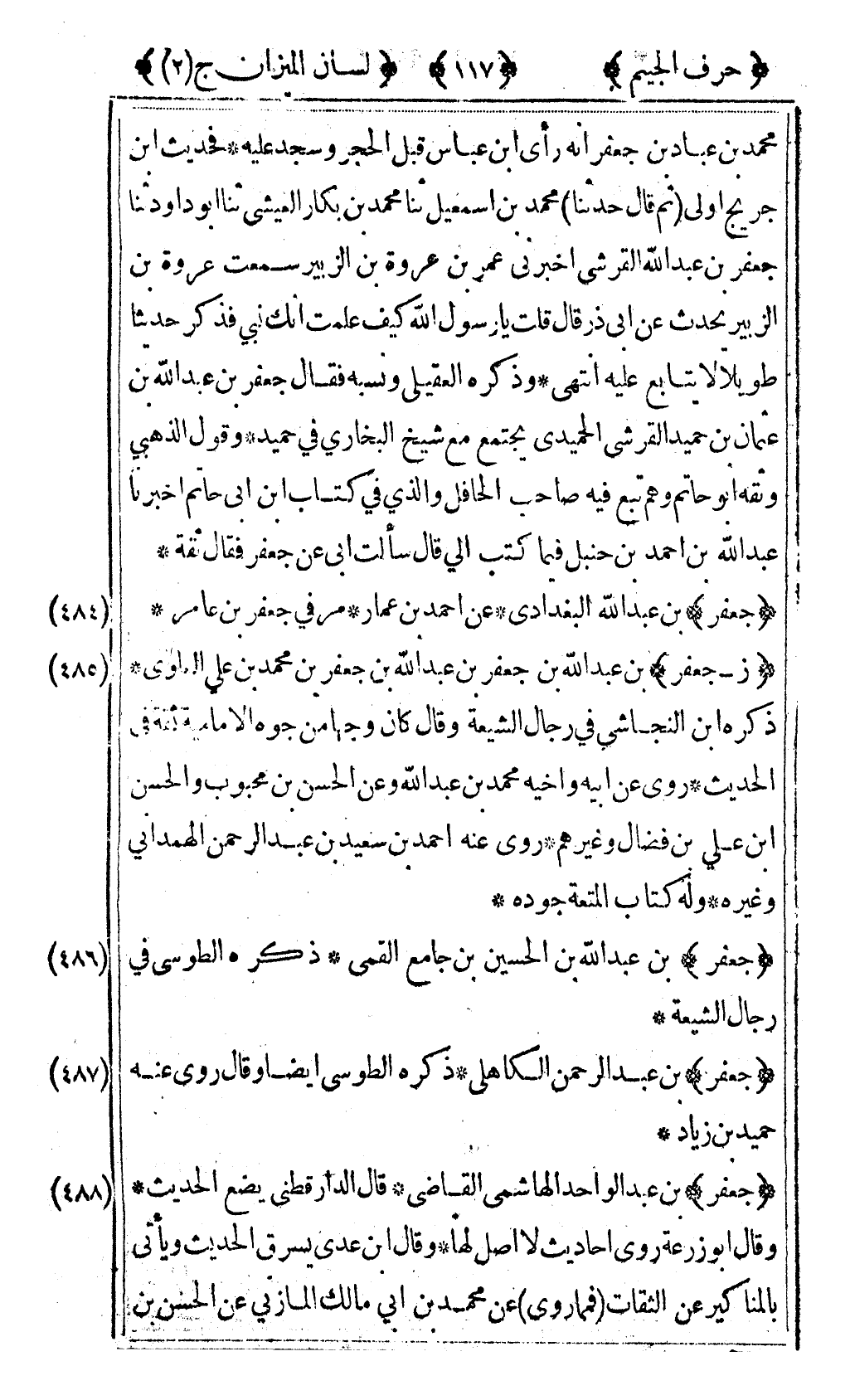 [485] "ز- جعفر" بن عبد الله ابن جعفر بن عبد الله ابن جعفر بن محمد بن علي العلوي ذكره ابن النجاشي في رجال الشيعة وقال كان وجها من وجوه الإمامية ثقة في الحديث روى عن أبيه وأخيه محمد بن عبد الله وعن الحسن بن محبوب والحسن بن علي بن فضال وغيرهم روى عنه أحمد بن سعيد بن عبد الرحمن الهمداني وغيره وله كتاب المتعة جوده.