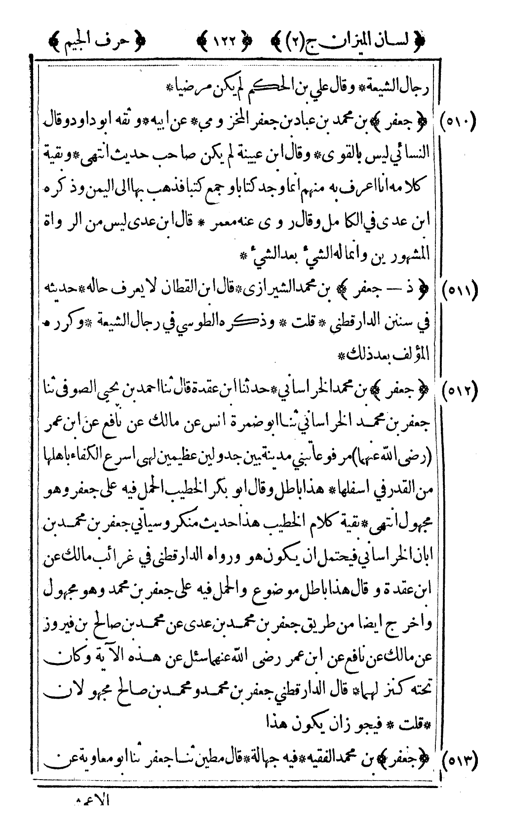 [511] "ذ-جعفر" بن محمد الشيرازي قال ابن القطان لا يعرف حاله حديثه في سنن الدارقطني قلت وذكره الطوسي في رجال الشيعة وكرره المؤلف بعد ذلك.