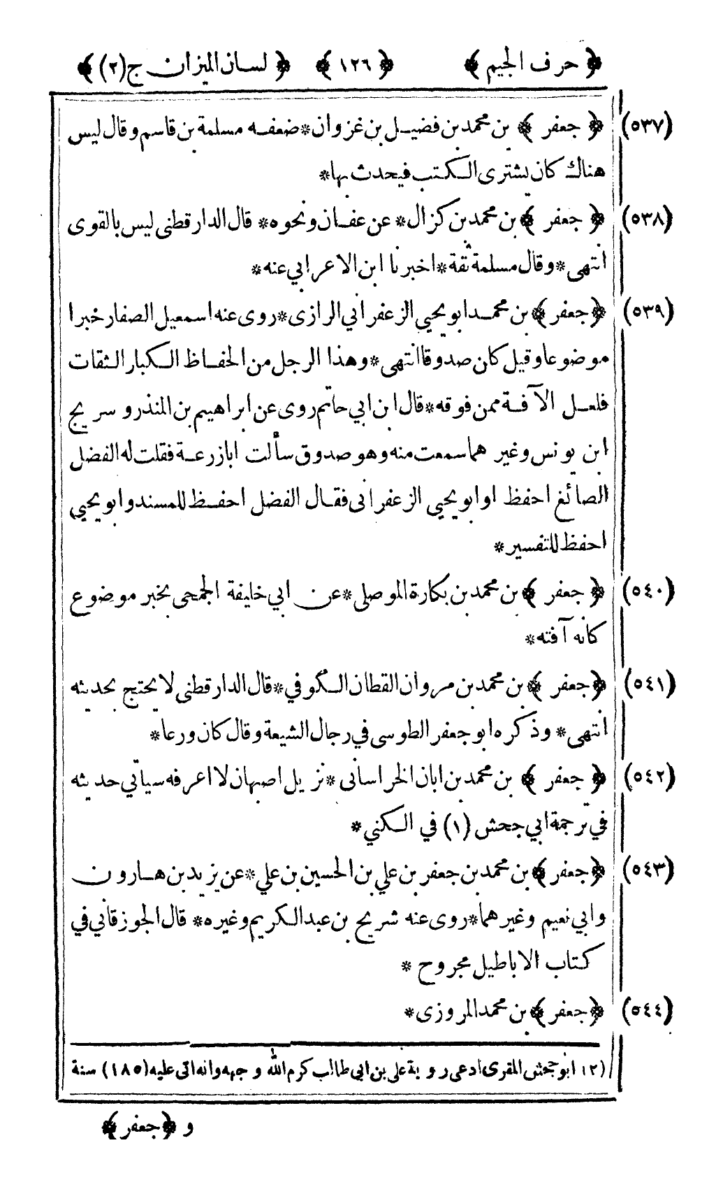 [537] "جعفر" بن محمد بن فضيل بن غزوان ضعفه مسلمة بن قاسم وقال ليس هناك كان يشتري الكتب فيحدث بها.