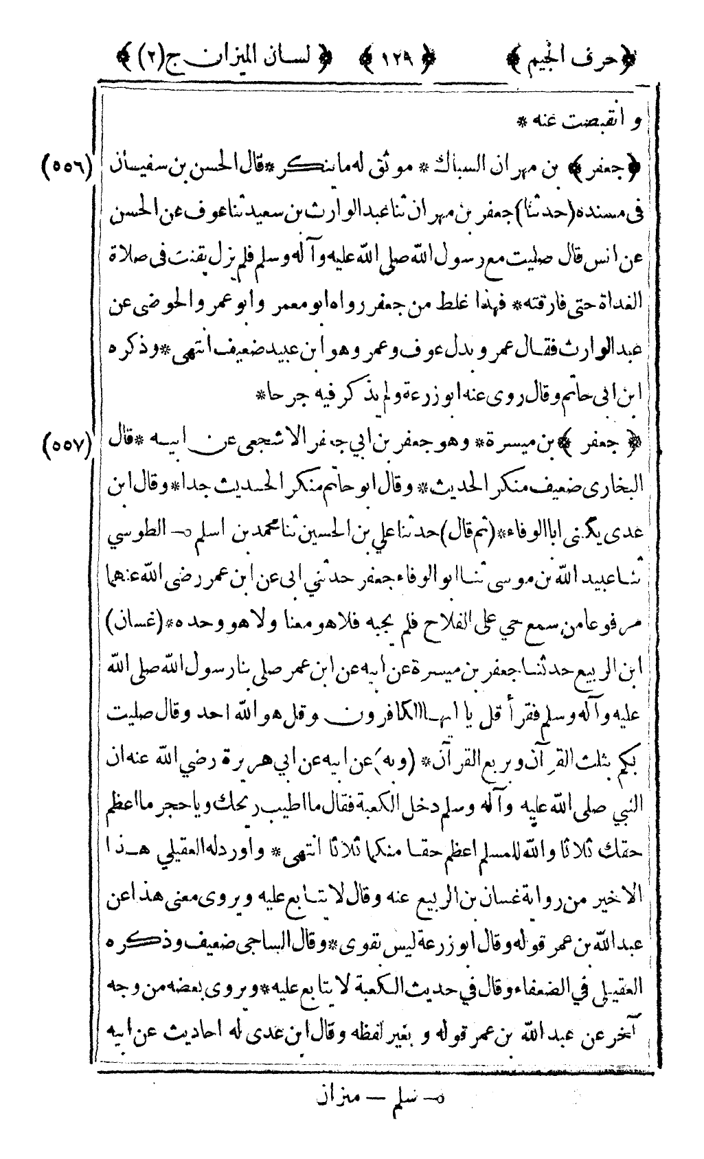 [557] "جعفر" بن ميسرة وهو جعفر بن أبي جعفر الأشجعي عن أبيه قال البخاري ضعيف منكر الحديث وقال أبو حاتم منكر الحديث جدا وقال ابن عدي يكنى أبا الوفاء ثم قال حدثنا علي بن الحسين ثنا محمد بن أسلم1 الطوسي ثنا عبيد الله ابن موسى ثنا أبو الوفاء جعفر حدثني أبي عن ابن عمر رضى الله عنهما مرفوعا "من سمع حي على الفلاح فلم يجبه فلا هو معنا ولا هو وحده" غسان بن الربيع حدثنا جعفر بن ميسرة عن أبيه عن ابن عمر "صلى بنا رسول الله صلى الله عليه وآله وسلم فقرأ قل يا أيها الكافرون وقل هو الله أحد وقال صليت بكم بثلث القرآن وبربع القرآن" وبه عن أبيه عن أبي هريرة رضى الله عنه أن النبي صلى الله عليه وآله وسلم دخل الكعبة فقال "ما أطيب ريحك ويا حجر ما أعظم حقك ثلاثا والله للمسلم أعظم حقا منكما ثلاثا" انتهى وأورد له العقيلي هذا الأخير من رواية غسان بن الربيع عنه وقال لا يتابع عليه ويروي معنى هذا عن عبد الله ابن عمر قوله وقال أبو زرعة ليس بقوي وقال الساجي ضعيف وذكره العقيلي في الضعفاء وقال في حديث الكعبة لا يتابع عليه ويروي بعضه من وجه آخر عن عبد الله ابن عمر قوله وبغير لفظه وقال ابن عدي له أحاديث عن أبيه