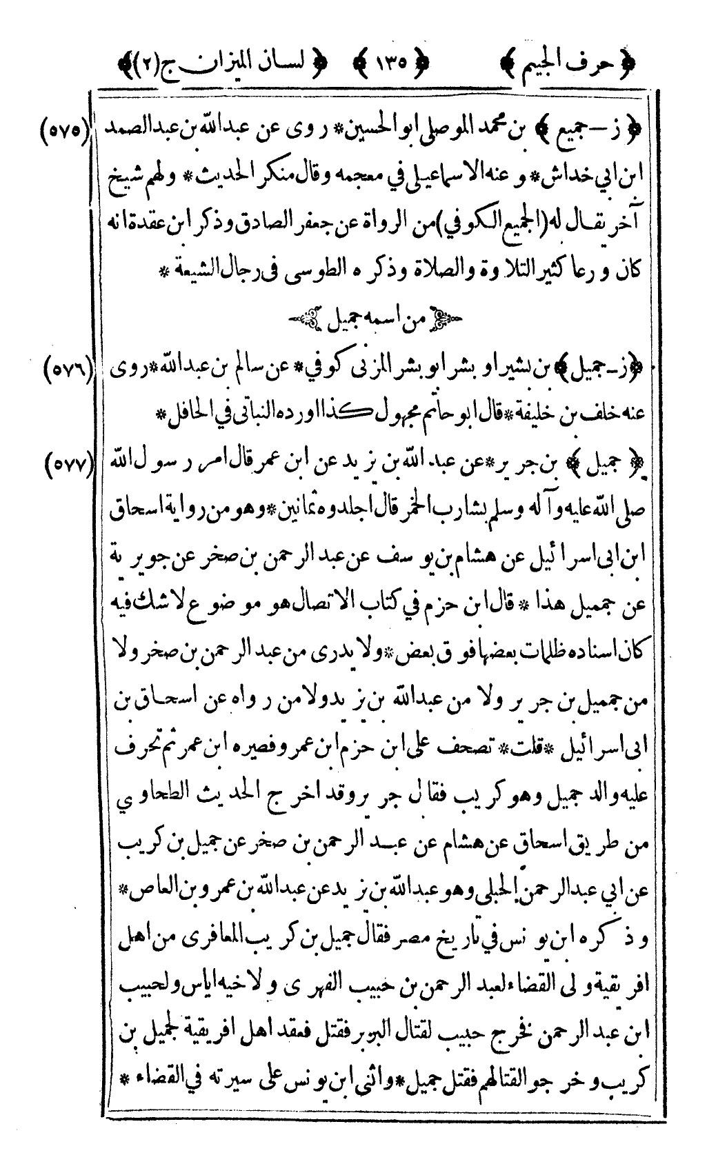 [577] "جميل" بن جرير عن عبد الله ابن يزيد عن ابن عمر قال "أمر رسول الله صلى الله عليه وآله وسلم بشارب الخمر قال اجلدوه ثمانين" وهو من رواية إسحاق بن أبي إسرائيل عن هشام بن يوسف عن عبد الرحمن بن صخر عن جويرية عن جميل هذا قال ابن حزم في كتاب الاتصال هو موضوع لا شك فيه كان إسناده ظلمات بعضها فوق بعض ولا يدرى من عبد الرحمن بن صخر ولا من جميل بن جري ولا من عبد الله ابن يزيد ولا من رواه عن إسحاق بن أبي إسرائيل قلت تصحف على بن حزم بن عمرو فصيره بن عمر ثم تحرف عليه والد جميل وهو كريب فقال جرير وقد اخرج الحديث الطحاوي من طريق إسحاق عن هشام عن عبد الرحمن بن صخر عن جميل بن كريب عن أبي عبد الرحمن الحبلي وهو عبد الله ابن يزيد عن عبد الله ابن عمرو بن العاص وذكره ابن يونس في تاريخ مصر فقال جميل بن كريب المعافري من أهل إفريقية ولي القضاء لعبد الرحمن بن حبيب الفهري ولاخيه إياس ولحبيب بن عبد الرحمن فخرج حبيب لقتال البربر فقتل فعقد أهل إفريقية لجميل بن كريب وخرجوا لقتالهم فقتل جميل وأثنى بن يونس على سيرته في القضاء.