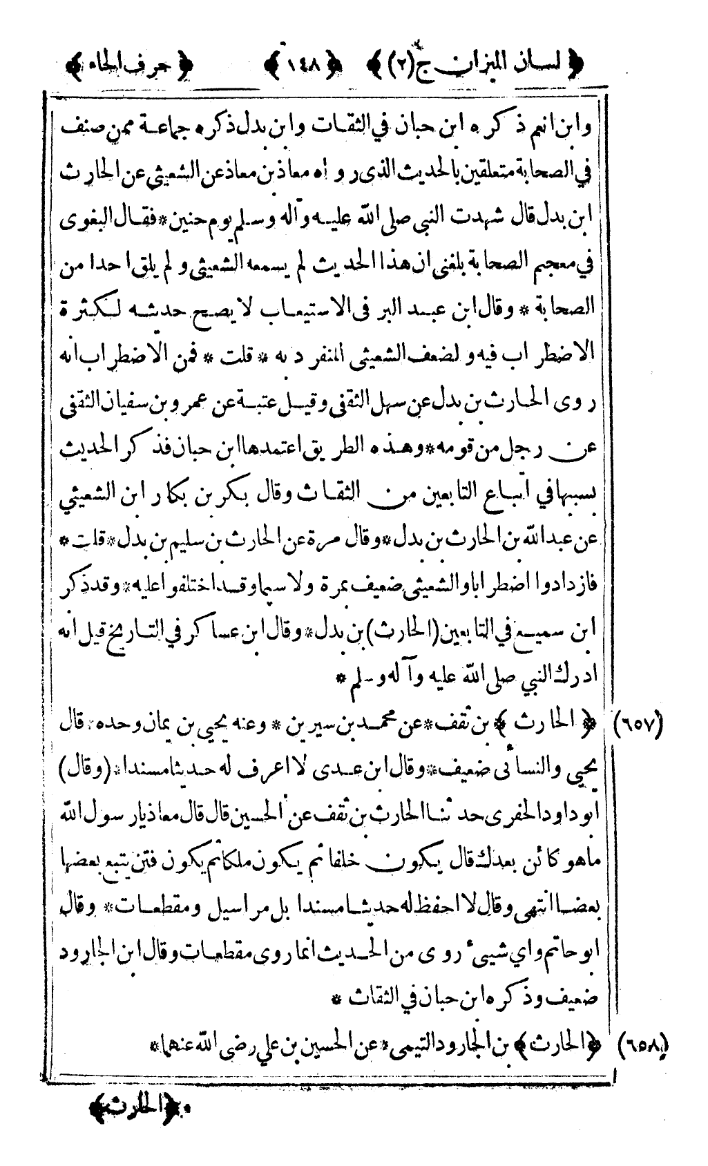 [657] "الحارث" بن ثقف عن محمد بن سيرين وعنه يحيى بن يمان وحده قال يحيى والنسائي ضعيف وقال ابن عدي لا أعرف له حديثا مسندا وقال أبو داود الحفري حدثنا الحارث بن ثقف عن الحسين قال: "قال معاذ يا رسول الله ما هو كائن بعدك قال يكون خلفا ثم يكون ملكا ثم يكون فتن يتبع بعضها بعضا" انتهى وقال لا احفظ له حديثا مسندا بل مراسيل ومقطعات وقال أبو حاتم وأي شيء روى من الحديث إنما روى مقطعات وقال ابن الجارود ضعيف وذكره ابن حبان في الثقات.