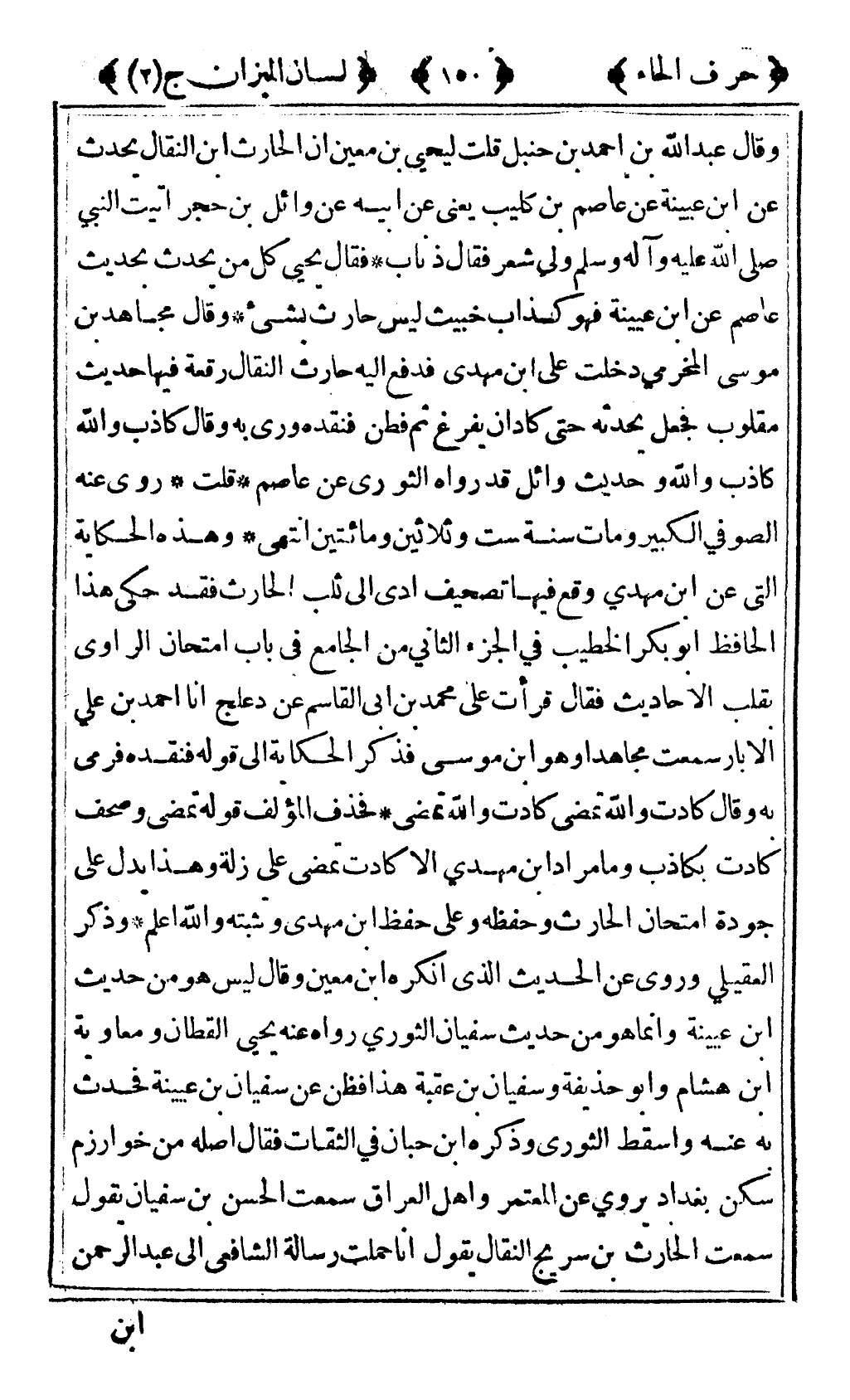 وقال عبد الله ابن أحمد بن حنبل قلت ليحيى بن معين ان الحارث بن النقال يحدث عن ابن عيينة عن عاصم بن كليب يعني عن أبيه عن وائل بن حجر أتيت النبي صلى الله عليه وآله وسلم ولي شعر فقال ذناب فقال يحيى كل من يحدث بحديث عاصم عن ابن عيينة فهو كذاب خبيث ليس حارث بشيء وقال مجاهد بن موسى المخرمي دخلت على بن مهدي فدفع إليه حارث النقال رقعة فيها حديث مقلوب فجعل يحدثه حتى كاد أن يفرغ ثم فطن فنقده وروى به وقال كاذب والله كاذب والله وحديث وائل قد رواه الثوري عن عاصم قلت روى عنه الصوفي الكبير ومات سنة ست وثلاثين ومائتين انتهى وهذه الحكاية التي عن ابن مهدي وقع فيها تصحيف أدى الى ثلب الحارث فقد حكى هذا الحافظ أبو بكر الخطيب في الجزء الثاني من الجامع في باب امتحان الراوي بقلب الأحاديث فقال قرأت على محمد بن أبي القاسم عن دعلج أنا أحمد بن علي الأبار سمعت مجاهدا وهو ابن موسى فذكر الحكاية الى قوله فنقده فرمى به وقال كادت والله تمضي كادت والله تمضي فحذف المؤلف قوله تمضي وصحف كادت بكاذب وما مراد بن مهدي الا كادت تمضي على زلة وهذا يدل على جودة امتحان الحارث وحفظه وعلى حفظ بن مهدي وتثبته والله أعلم وذكر العقيلي وروى عن الحديث الذي أنكره بن معين وقال ليس هو من حديث بن عيينة وإنما هو من حديث سفيان الثوري رواه عنه يحيى القطان ومعاوية بن هشام وأبو حذيفة وسفيان بن عقبة هذا فظن عن سفيان بن عيينة فحدث به عنه واسقط الثوري وذكره ابن حبان في الثقات فقال أصله من خوارزم سكن بغداد يروي عن المعتمر وأهل العراق سمعت الحسن بن سفيان يقول سمعت الحارث بن سريج النقال يقول أنا حملت رسالة الشافعي الى عبد الرحمن