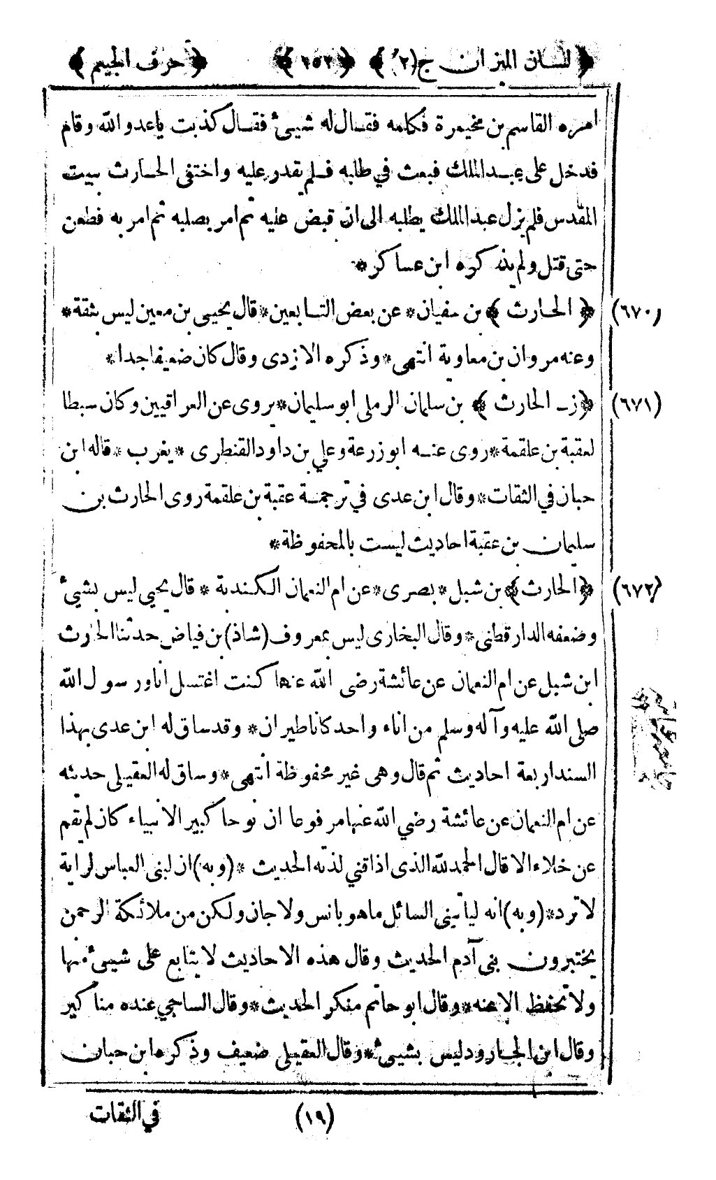 [670] "الحارث" بن سفيان عن بعض التابعين قال يحيى بن معين ليس بثقة وعنه مروان بن معاوية انتهى وذكره الأزدي وقال كان ضعيفا جدا.