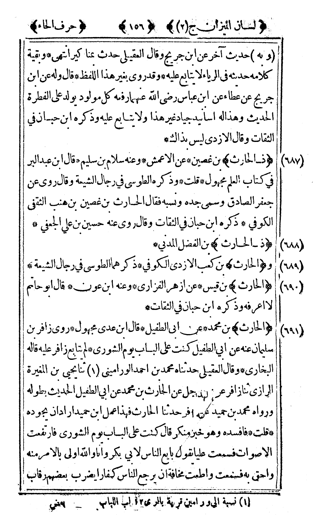 [691] "الحارث" بن محمد عن أبي الطفيل قال ابن عدي مجهول روى زافر بن سليمان عنه عن أبي الطفيل كنت على الباب يوم الشورى لم يتابع زافر عليه قاله البخاري وقال العقيلي حدثناه محمد بن أحمد الوراميني1 ثنا يحيى بن المغيرة الرازي ثنا زافر عن رجل عن الحارث بن محمد عن أبي الطفيل الحديث بطوله ورواه محمد بن حميد عن زافر حدثنا الحارث فهذا عمل بن حميد أراد أن يجوده قلت فافسده وهو خبر منكر قال كنت على الباب يوم الشورى فارتفعت الأصوات فسمعت عليا يقول بايع الناس لأبي بكر وأنا والله أولى بالأمر منه وأحق به فسمعت وأطعت مخافة أن يرجع الناس كفارا يضرب بعضهم رقاب