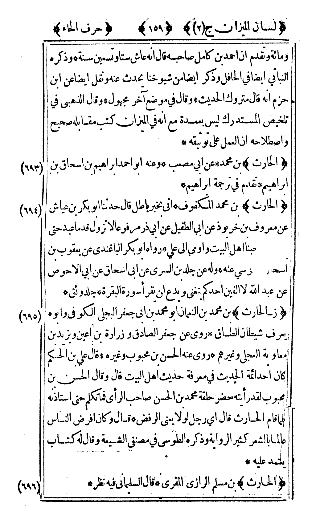 [696] "الحارث" بن مسلم الرازي المقري قال السلماني فيه نظر.
