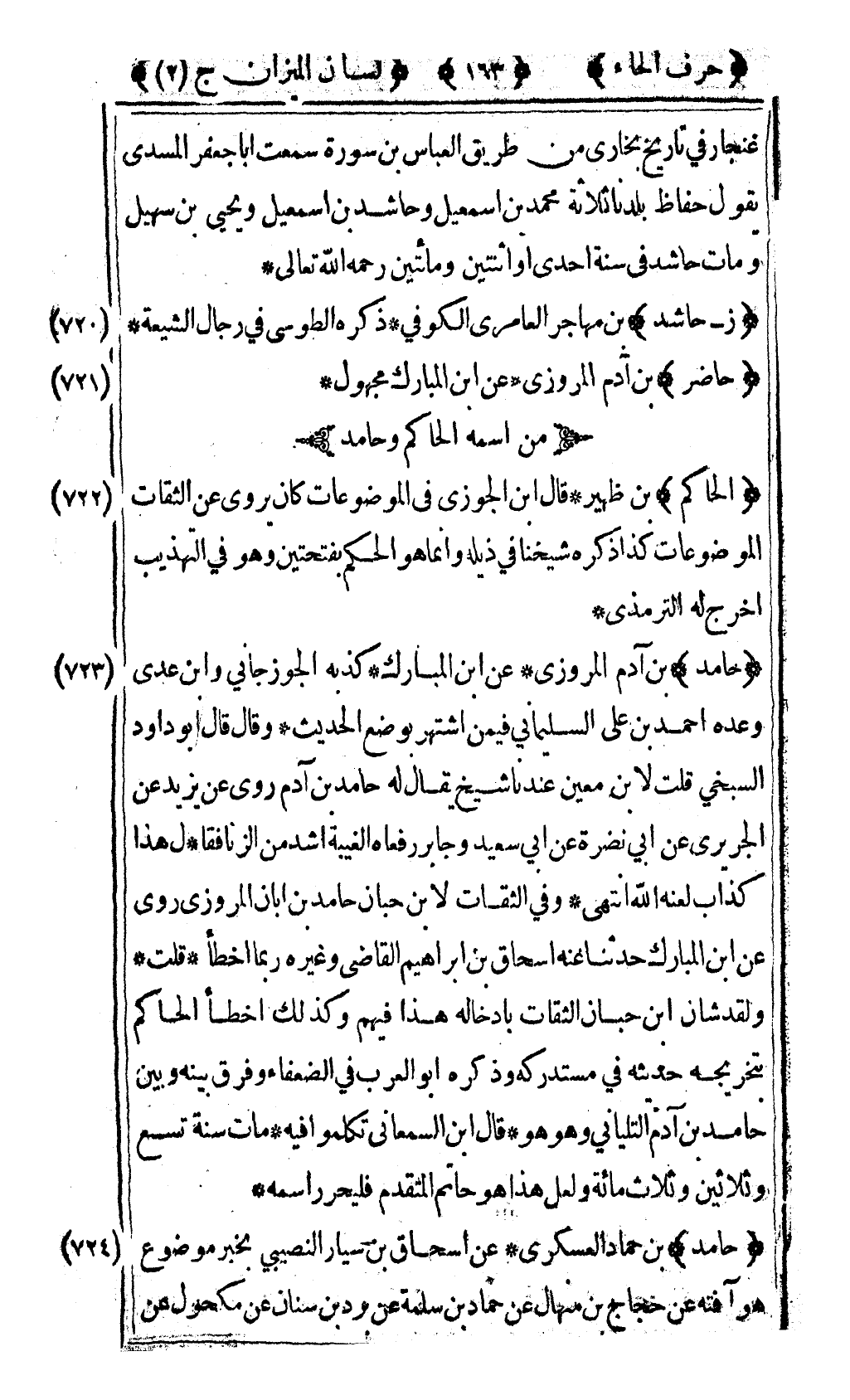 [723] "حامد" بن آدم المروزي عن ابن المبارك كذبه الجوزجاني وابن عدي وعده أحمد بن علي السليماني فيمن اشتهر بوضع الحديث وقال: قال أبو داود السبخي قلت لابن معين عندنا شيخ يقال له حامد بن آدم روى عن يزيد عن الجريري عن أبي نضرة عن أبي سعيد وجابر رفعاه الغيبة أشد من الزنا فقال هذا كذاب لعنه الله انتهى وفي الثقات لابن حبان حامد بن أبان المروزي روى عن ابن المبارك حدثنا عنه إسحاق بن إبراهيم القاضي وغيره ربما أخطأ قلت ولقد شان بن حبان الثقات بإدخاله هذا فيهم وكذلك أخطأ الحاكم بتخريجه حديثه في مستدركه وذكره أبو العرب في الضعفاء وفرق بينه وبين حامد بن آدم التلياني وهو هو قال ابن السمعاني تكلموا فيه مات سنة تسع وثلاثين وثلاث مائة ولعل هذا هو حاتم المتقدم فليحرر اسمه.