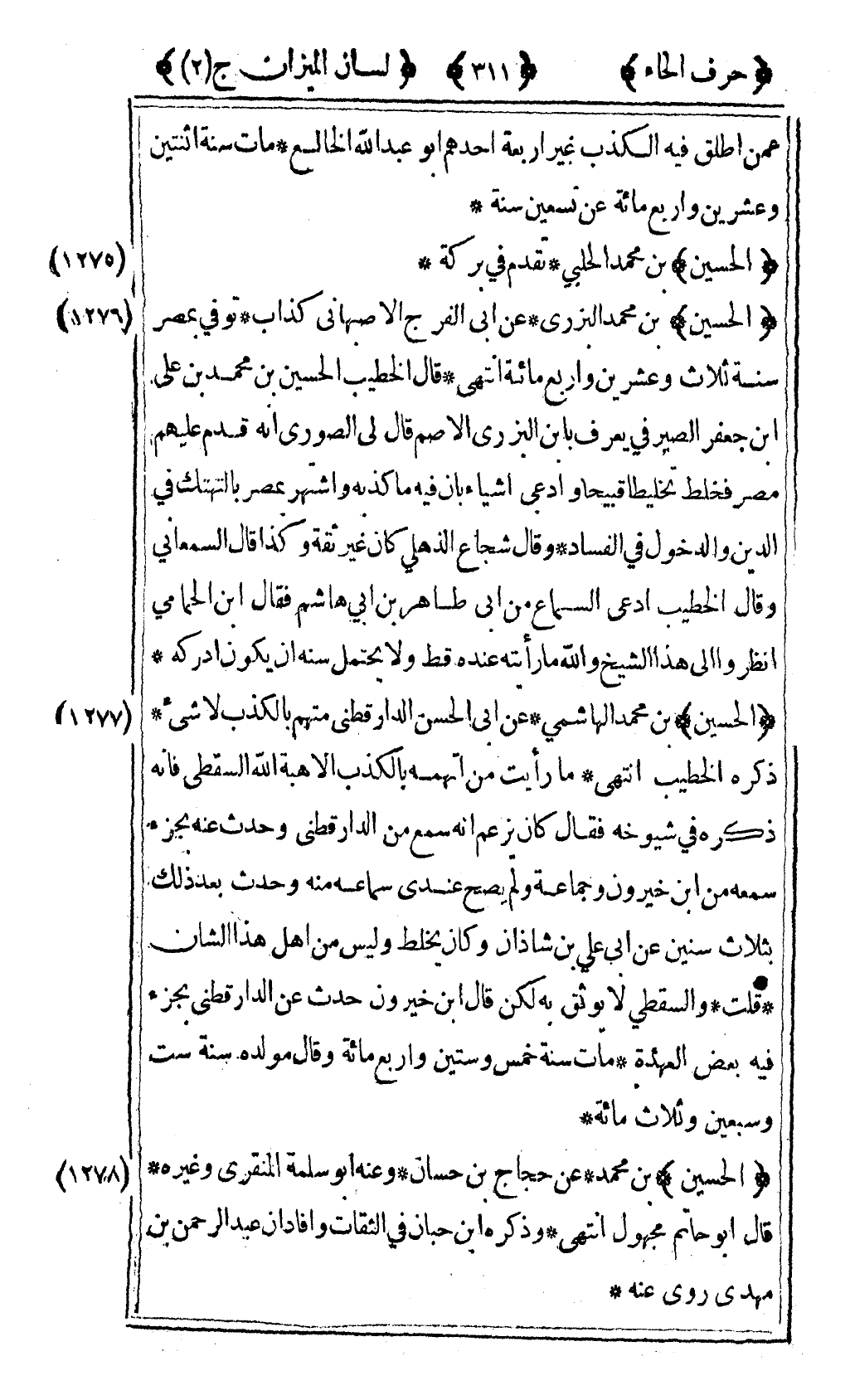 [1277] "الحسين" بن محمد الهاشمي عن أبي الحسين الدارقطني متهم بالكذب لا شيء ذكره الخطيب انتهى ما رأيت من اتهمه بالكذب الا هبة الله السقطي فإنه ذكره في شيوخه فقال كان يزعم أنه سمع من الدارقطني وحدث عنه بجزء سمعه من بن خيرون وجماعة ولم يصح عندي سماعه منه وحدث بعد ذلك بثلاث سنين عن أبي علي بن شاذان وكان يخلط وليس من أهل هذا الشأن قلت والسقطي لا يوثق به لكن قال ابن خيرون حدث عن الدارقطني بجزء فيه بعض العهدة مات سنة خمس وستين وأربع مائة وقال مولده سنة ست وسبعين وثلاث مائة.