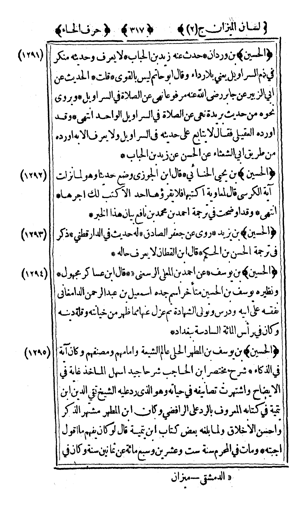 [1292] "الحسين" بن يحيى الحنائي قال ابن الجوزي وضع حديثا وهو لما نزلت آية الكرسي قال لمعاوية اكتبها فلا يقرؤها أحد إلا كتب لك أجرها انتهى وقد أوضحت في ترجمة أحمد بن محمد بن نافع بيان هذا الخبر.