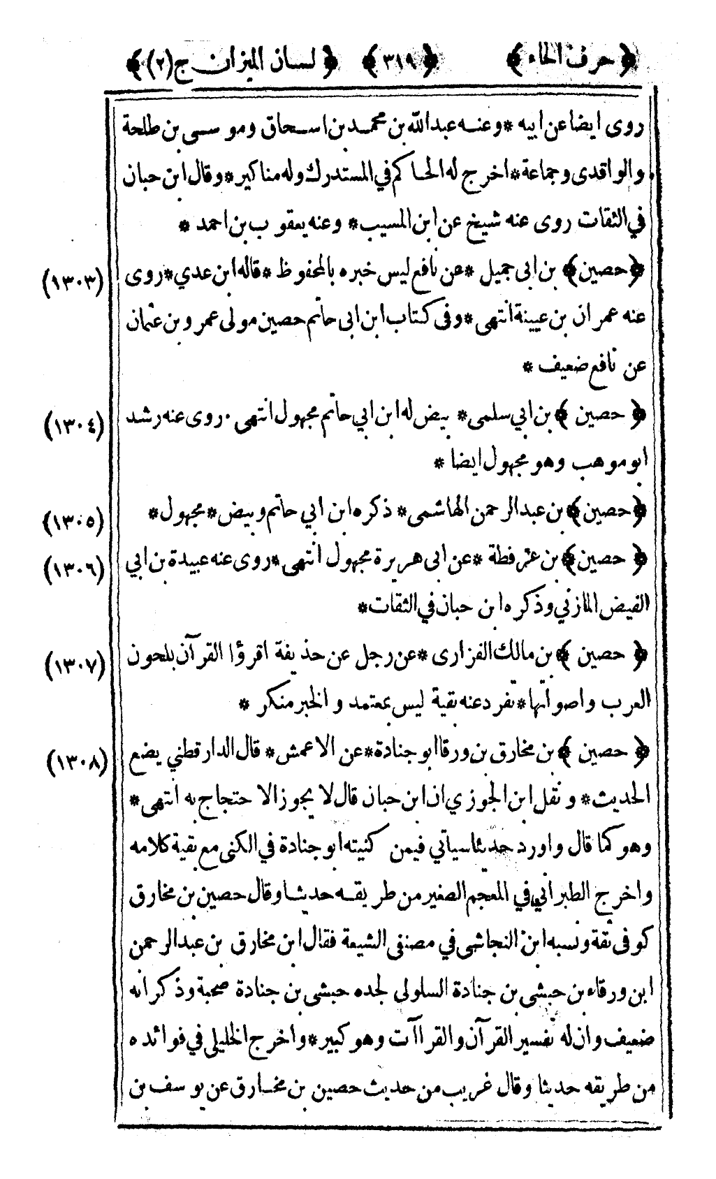[1305] "حصين" بن عبد الرحمن الهاشمي ذكره ابن أبي حاتم وبيض مجهول.