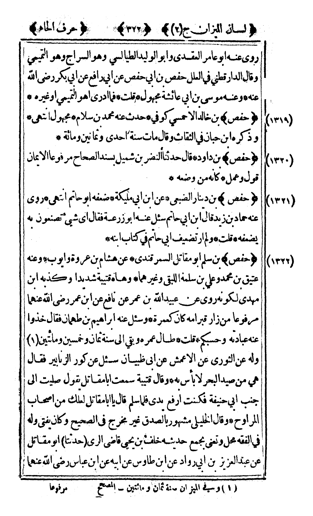 [1322] "حفص" بن سلم أبو مقاتل السمرقندي عن هشام بن عروة وأيوب وعنه عتيق بن محمد وعلي بن سلمة اللبقي وغيرهما قتيبة شديدا وكذبه بن مهدي لكونه روى عن عبيد الله ابن عمر عن نافع عن ابن عمر رضى الله عنهما مرفوعا "من زار قبر أمه كان كعمرة" وسئل عنه إبراهيم بن طهمان فقال خذوا عنه عبادته وحسبكم قلت طال عمره وبقي الى سنة ثمان وخمسين ومائتين1 وله عن الثوري عن الأعمش عن أبي ظبيان سئل عن كور الزنابير فقال هي من صيد البحر لا بأس به وقال قتيبة سمعت أبا مقاتل يقول صليت الى جنب أبي حنيفة فكنت أرفع يدي فلما سلم قال يا أبا مقاتل لعلك من أصحاب المراوح وقال الخليلي مشهور بالصدق غير مخرج في الصحيح وكان يفتي وله في الفقه محل وتعنى بجمع حديثه خلف بن يحيى قاضي الري حدثنا أبو مقاتل عن عبد العزيز بن أبي رواد عن ابن طاوس عن أبيه عن ابن عباس رضى الله عنهما