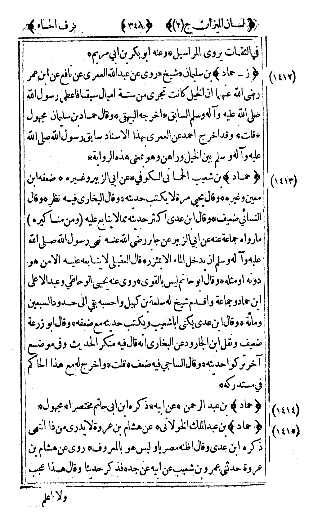 [1414] "حماد" بن عبد الرحمن عن أبيه ذكره ابن أبي حاتم مختصرا مجهول.