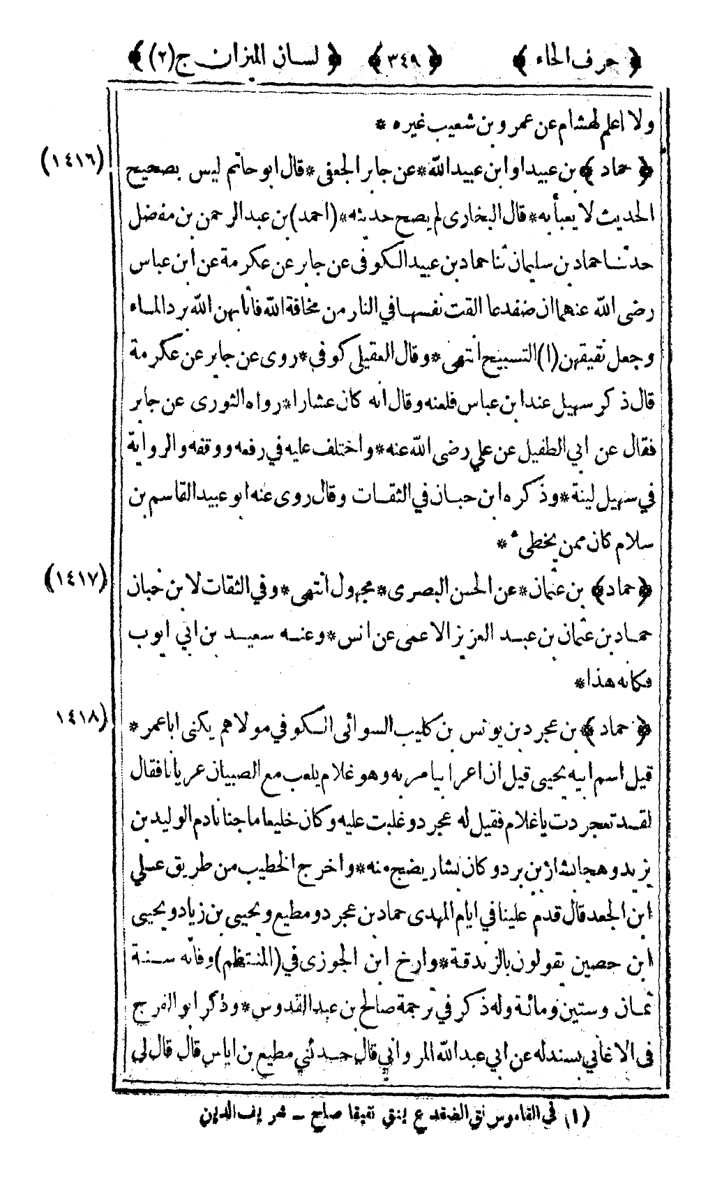 [1417] "حماد" بن عثمان عن الحسن البصري مجهول انتهى وفي الثقات لابن حبان حماد بن عثمان بن عبد العزيز الأعمى عن أنس وعنه سعيد بن أبي أيوب فكأنه هذا.