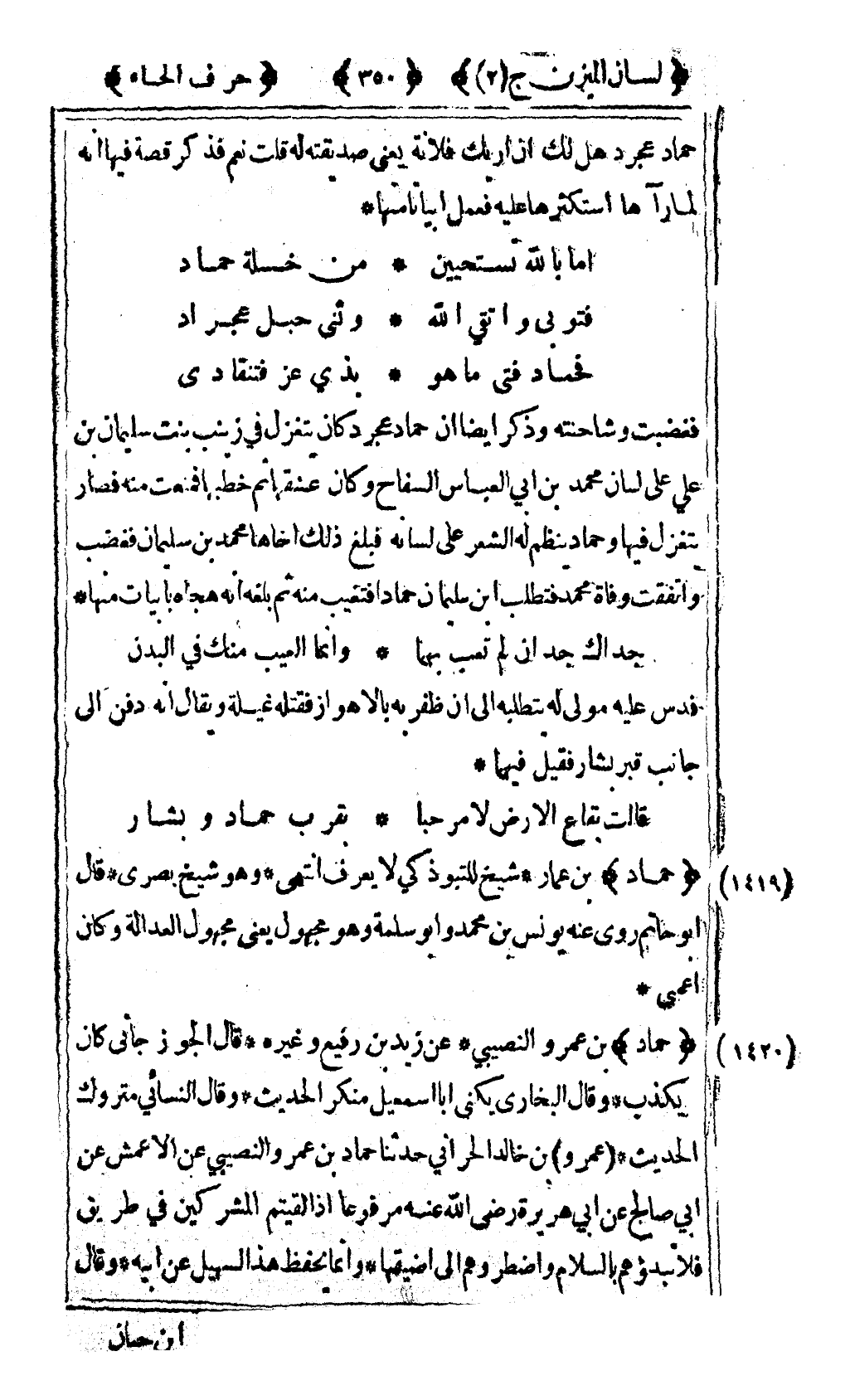 [1419] "حماد" بن عمار شيخ للتبوذكي لا يعرف انتهى وهو شيخ بصري قال أبو حاتم روى عنه يونس بن محمد وأبو سلمة وهو مجهول يعني مجهول العدالة وكان أعمى.