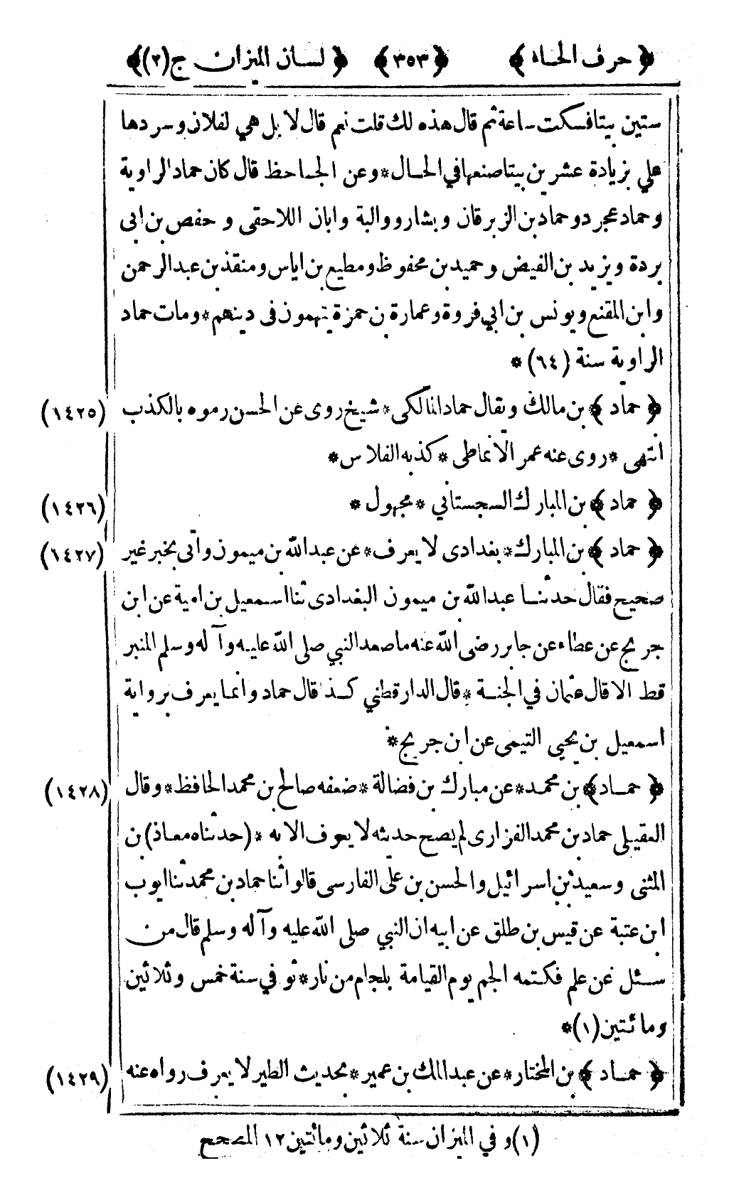 [1428] "حماد" بن محمد عن مبارك بن فضالة ضعفه صالح بن محمد الحافظ وقال العقيلي حماد بن محمد الفزاري لم يصح حديثه لا يعرف الا به حدثنا معاذ بن المثنى وسعيد بن إسرائيل والحسن بن علي الفارسي قالوا ثنا حماد بن محمد ثنا أيوب بن عتبة عن قيس بن طلق عن أبيه ان النبي صلى الله عليه وآله وسلم قال "من سئل عن علم فكتمه ألجم يوم القيامة بلجام من نار" توفي سنة خمس وثلاثين ومائتين1.