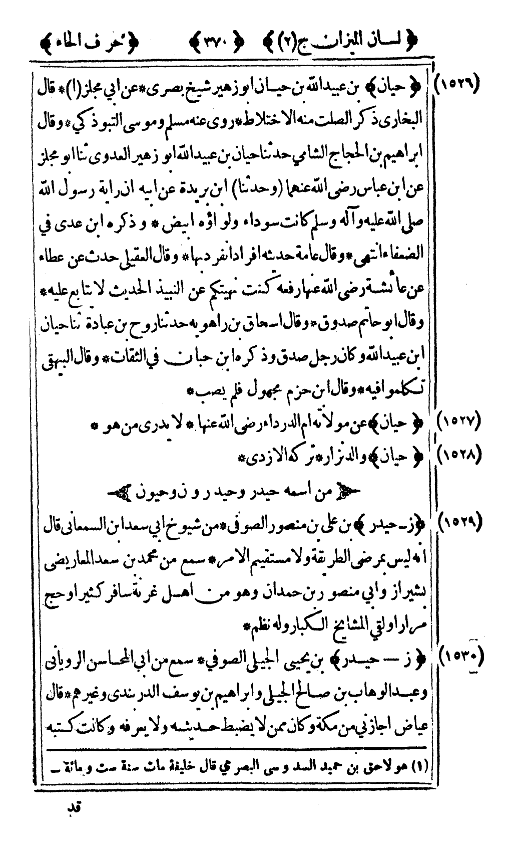 [1529] "ز- حيدر" بن علي بن منصور الصوفي من شيوخ أبي سعد بن السمعاني قال أنه ليس بمرضي الطريقة ولا مستقيم الأمر سمع من محمد بن سعد المعاريضي بشيراز وأبي منصور بن حمدان وهو من أهل غرنة سافر كثيرا وحج مرارا ولقي المشايخ الكبار وله نظم.