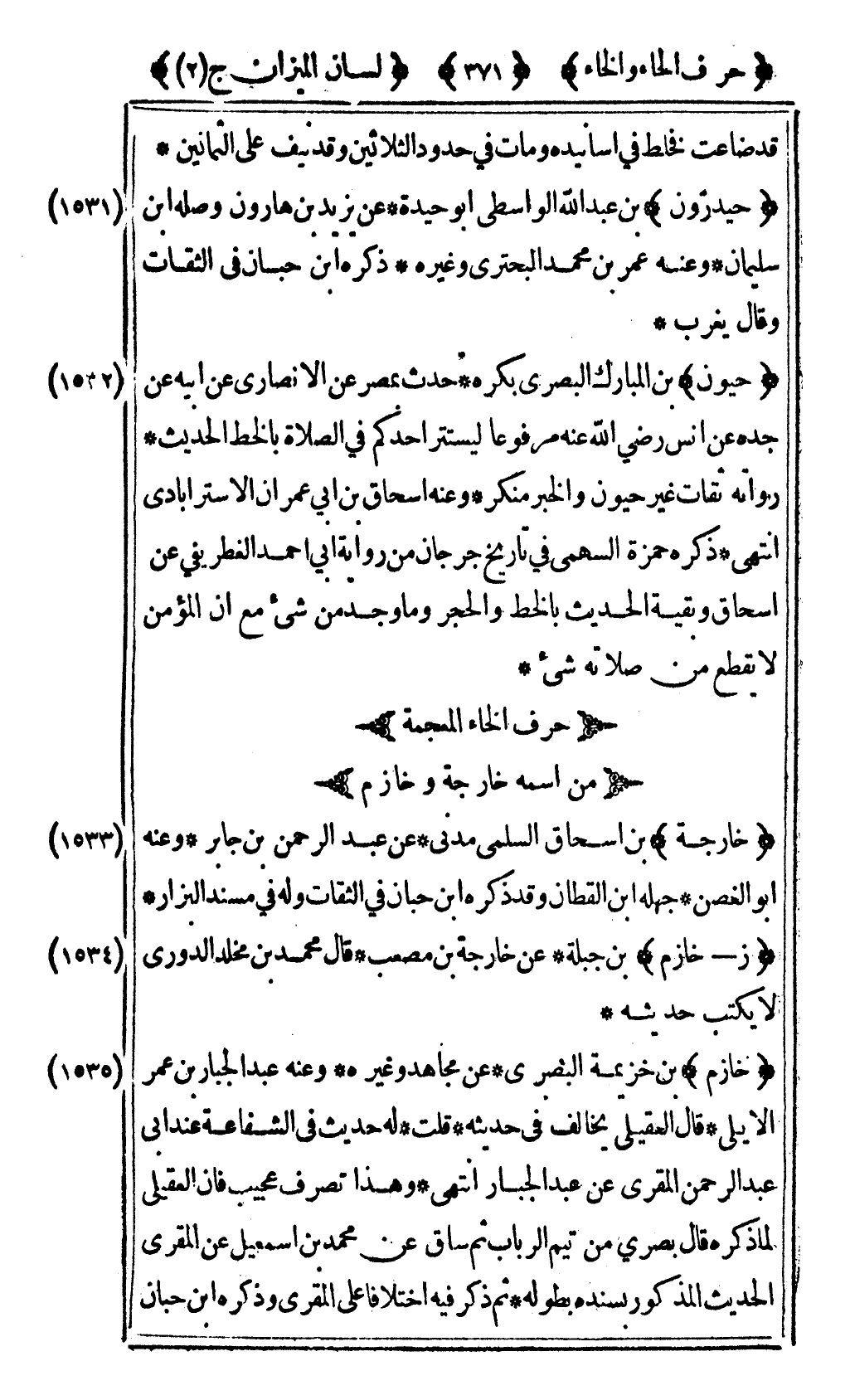 [1531] "حيدرون" بن عبد الله الواسطي أبو حيدة عن يزيد بن هارون وصله ابن سليمان وعنه عمر بن محمد البحتري وغيره ذكره ابن حبان في الثقات وقال يغرب.