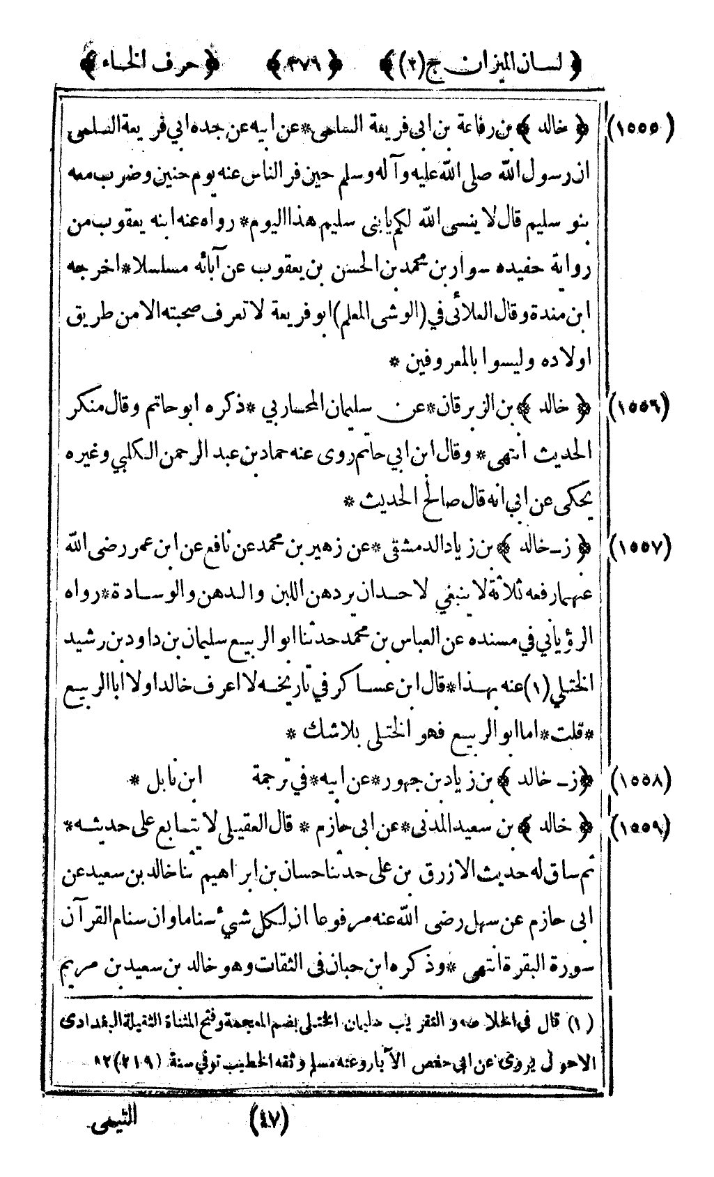 [1556] "خالد" بن الزبرقان عن سليمان المحاربي ذكره أبو حاتم وقال منكر الحديث انتهى وقال ابن أبي حاتم روى عنه حماد بن عبد الرحمن الكلبي وغيره يحكى عن أبي أنه قال صالح الحديث.