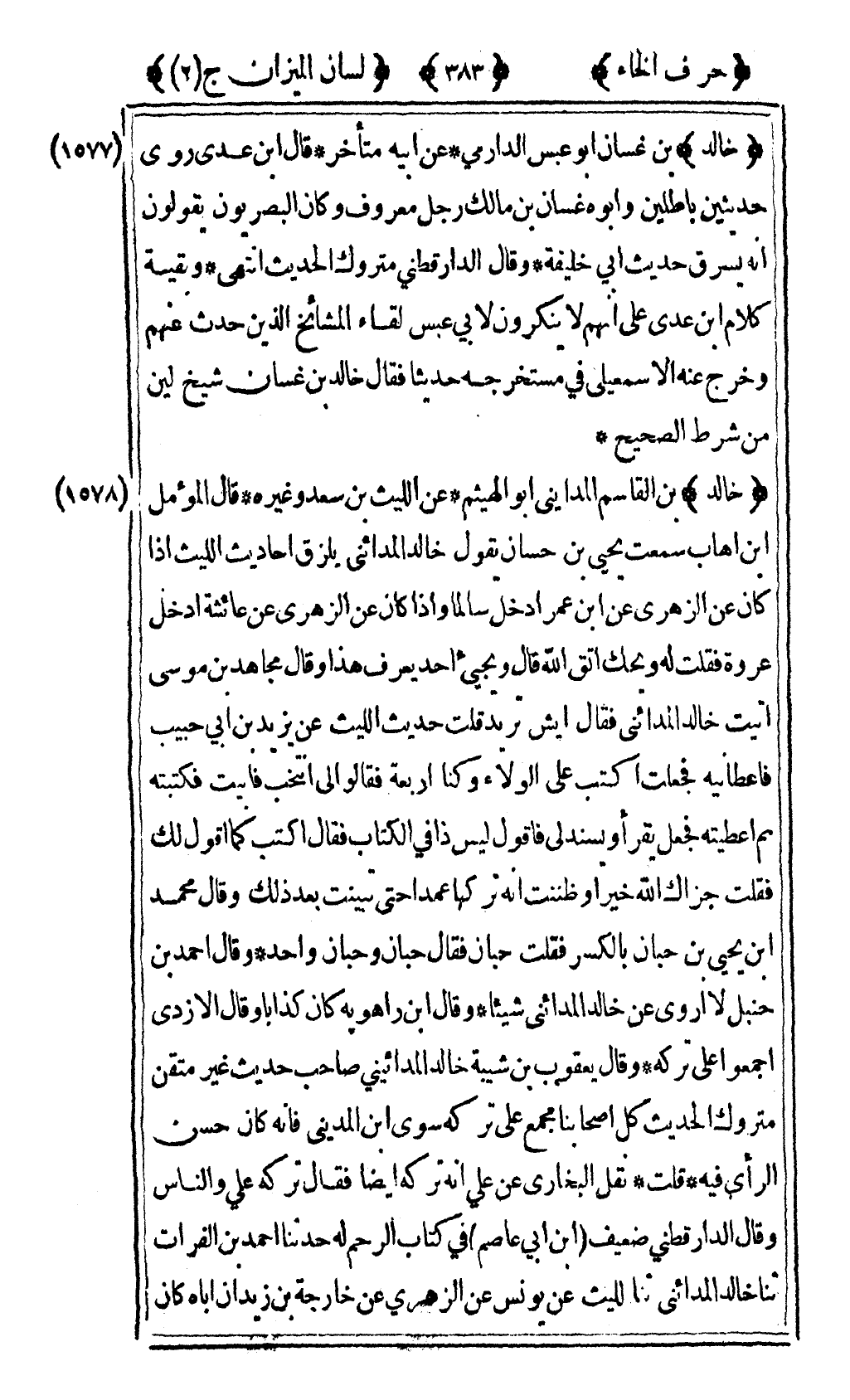 [1578] "خالد" بن القاسم المدايني أبو الهيثم عن الليث بن سعد وغيره قال المؤمل بن أهاب سمعت يحيى بن حسان يقول خالد المدائني يلزق أحاديث الليث إذا كان عن الزهري عن ابن عمر أدخل سالما وإذا كان عن الزهري عن عائشة أدخل عروة فقلت له ويحك اتق الله قال ويجيء أحد يعرف هذا وقال مجاهد بن موسى أتيت خالد المدائني فقال أيش تريد قلت حديث الليث عن يزيد بن أبي حبيب فأعطانيه فجعلت أكتب على الولاء وكنا أربعة فقالوا لي انتخب فأبيت فكتبته ثم أعطيته فجعل يقرأ ويسند لي فأقول ليس ذا في الكتاب فقال اكتب كما أقول لك فقلت جزاك الله خيرا وظننت أنه تركها عمدا حتى تبينت بعد ذلك وقال محمد بن يحيى بن حبان بالكسر فقلت حبان فقال حبان وحبان واحد وقال أحمد بن حنبل لا أروي عن خالد المدائني شيئا وقال ابن راهويه كان كذابا وقال الأزدي أجمعوا على تركه وقال يعقوب بن شيبة خالد المدائني صاحب حديث غير متقن متروك الحديث كل أصحابنا مجمع على تركه سوى بن المديني فإنه كان حسن الرأي فيه قلت نقل البخاري عن علي أنه تركه أيضا فقال تركه علي والناس وقال الدارقطني ضعيف بن أبي عاصم في كتاب الرحم له حدثنا أحمد بن الفرات ثنا خالد المدائني ثنا الليث عن يونس عن الزهري عن خارجة بن زيدان أن أباه كان