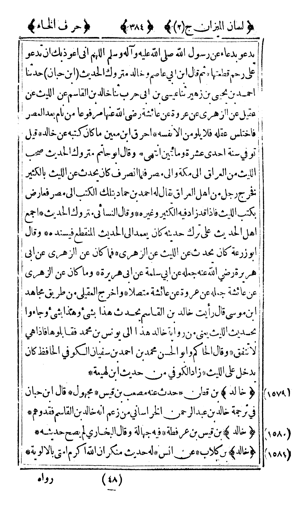 [1579] "خالد" بن قطن حدث عنه مصعب بن قيس مجهول قال ابن حبان في ترجمة خالد بن عبد الرحمن الخراساني من زعم أنه خالد بن القاسم فقد وهم.
