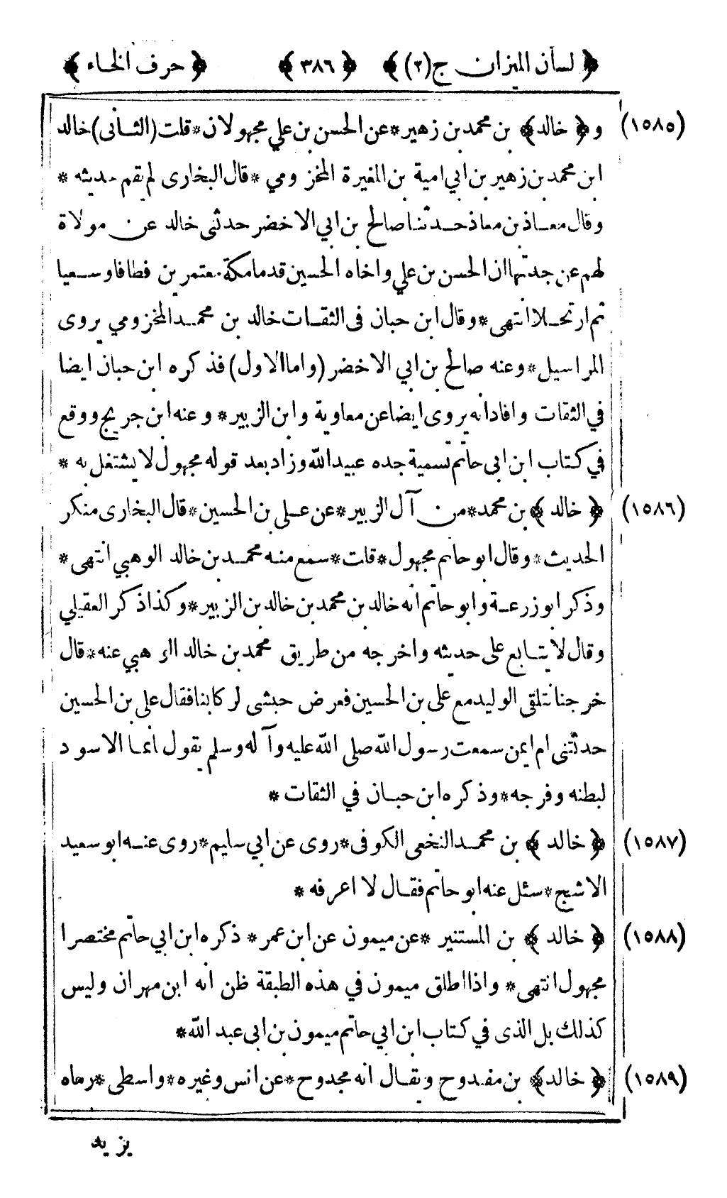 [1586] "خالد" بن محمد من آل الزبير عن علي بن الحسين قال البخاري منكر الحديث وقال أبو حاتم مجهول قلت سمع منه محمد بن خالد الوهبي انتهى وذكر أبو زرعة وأبو حاتم أنه خالد بن محمد بن خالد بن الزبير وكذا ذكر العقيلي وقال لا يتابع على حديثه وأخرجه من طريق محمد بن خالد الوهبي عنه قال خرجنا نتلقى الوليد مع علي بن الحسين فعرض حبشي لركابنا فقال علي بن الحسين حدثتني أم أيمن سمعت رسول الله صلى الله عليه وآله وسلم يقول "إنما الأسود لبطنه وفرجه" وذكره ابن حبان في الثقات.