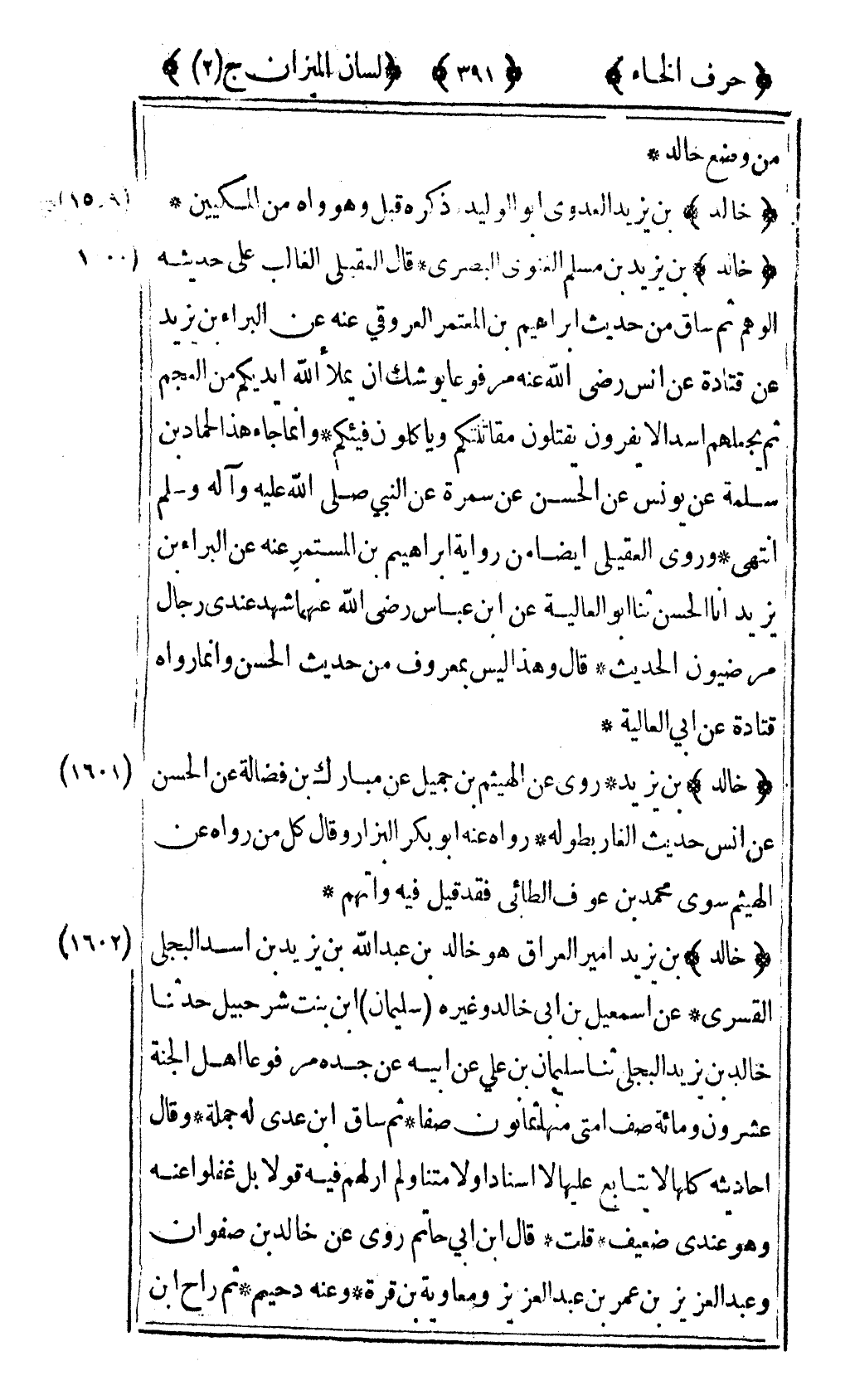 [1600] "خالد" بن يزيد بن مسلم الغنوي البصري قال العقيلي الغالب على حديثه الوهم ثم ساق من حديث إبراهيم بن المعتمر العروقي عنه عن البراء بن يزيد عن قتادة عن أنس رضى الله عنه مرفوعا "يوشك أن يملأ الله أيديكم من العجم ثم يجعلهم أسدا لا يفرون يقتلون مقاتلتكم ويأكلون فيئكم" وانما جاء هذا لحماد بن سلمة عن يونس عن الحسن عن سمرة عن النبي صلى الله عليه وآله وسلم انتهى وروى العقيلي أيضا من رواية إبراهيم بن المستمر عنه عن البراء بن يزيد انا الحسن ثنا أبو العالية عن ابن عباس رضى الله عنهما شهد عندي رجال مرضيون الحديث قال وهذا ليس بمعروف من حديث الحسن وانما رواه قتادة عن أبي العالية.